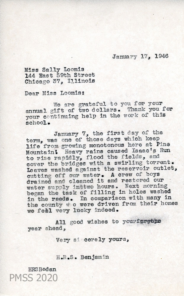 033 January 17, 1946. To Miss Sally Loomis in Chicago, IL, from H.R.S. Benjamin [Director], thanking Loomis for her annual gift; describes the flooding of Isaac’s Run and clogging of the reservoir by leaves.
