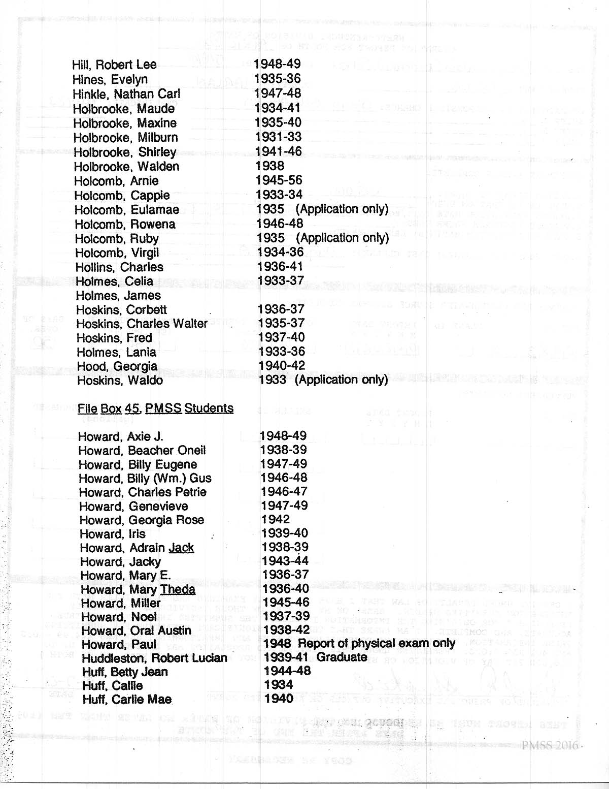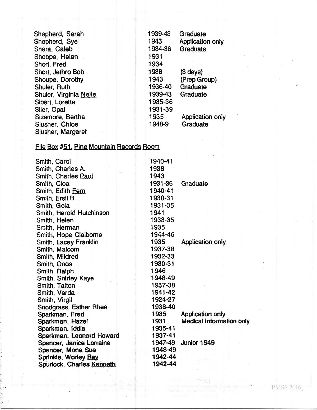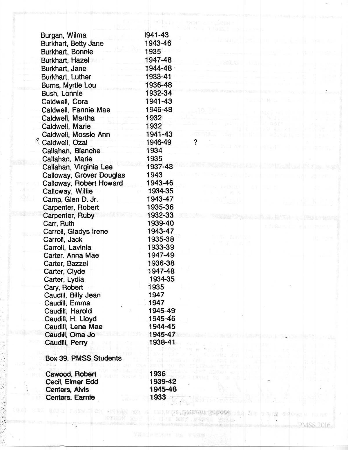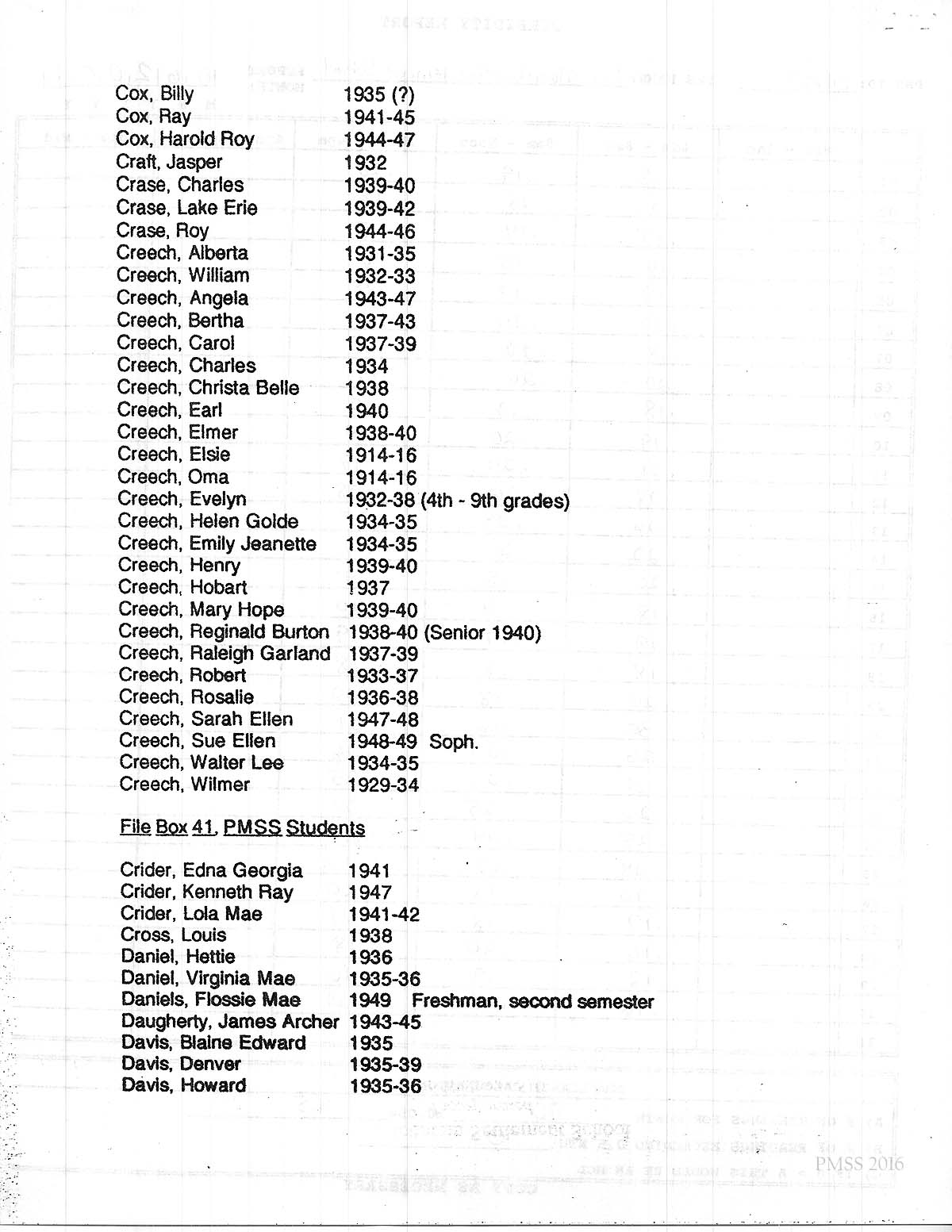 TAGS: Early list of PMSS boarding school students, student lists, grades, years at school, Pine Mountain Settlement School, Harlan County KY