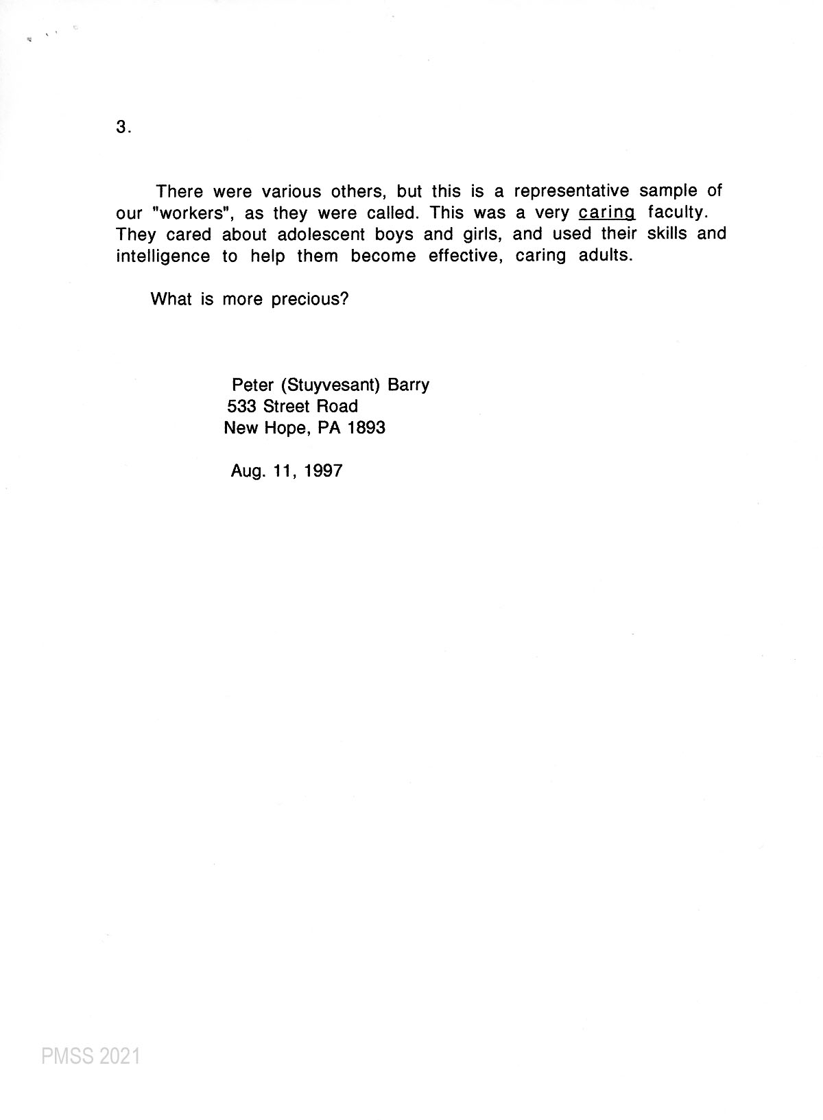 This page features images and transcriptions of excerpts from Peter Barry’s autobiography dated August 11, 1997, covering his time at PMSS from 1944 to 1947. His narrative begins with notes concerning PMSS staff during that time.