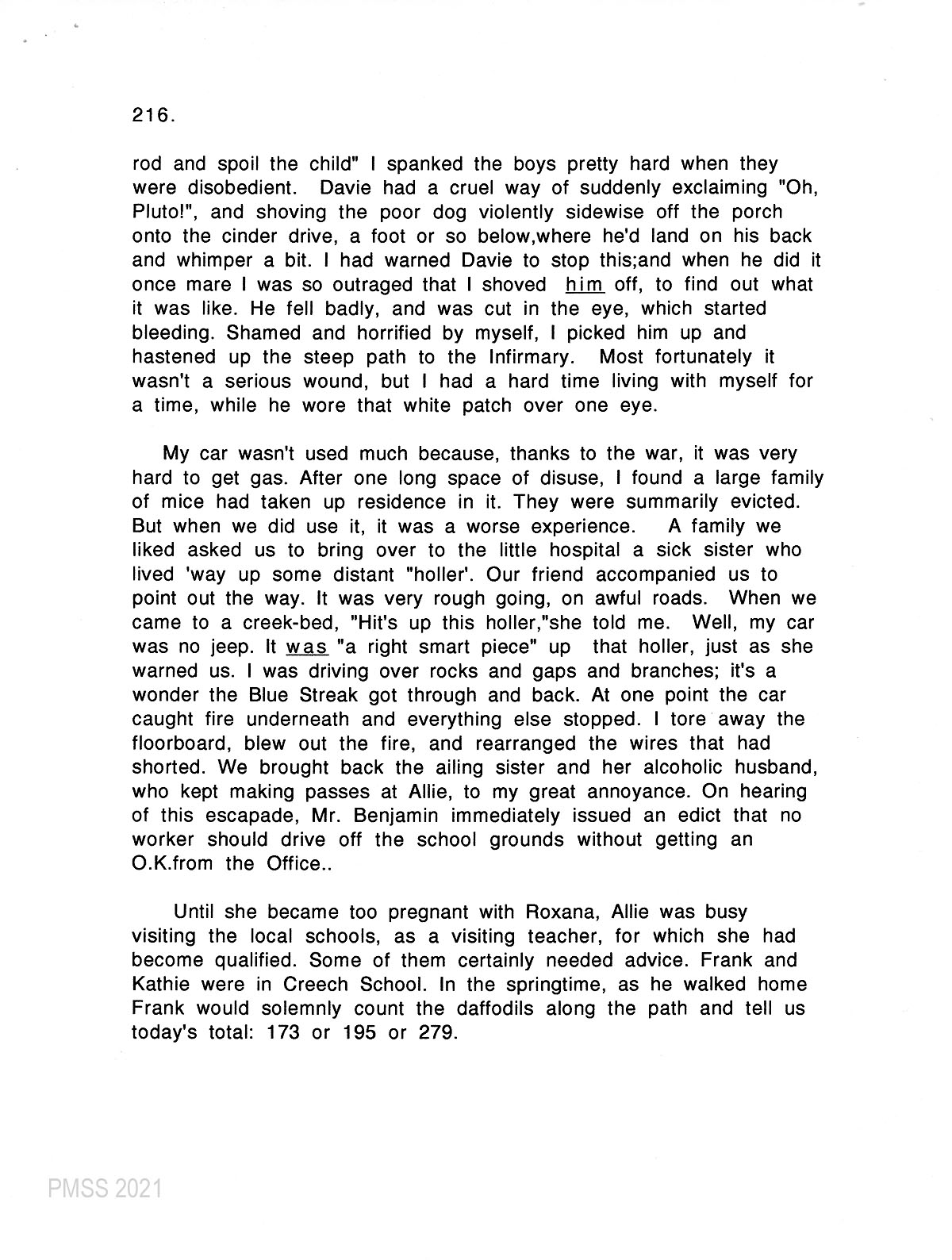 Until she became too pregnant with Roxana, Allie was busy visiting the local schools, as a visiting teacher, for which she had become qualified. Some of them certainly needed advice. Frank and Kathie were in Creech School. In the springtime, as he walked home Frank would solemnly count the daffodils along the path and tell us today’s total: 173 or 195 or 279.
