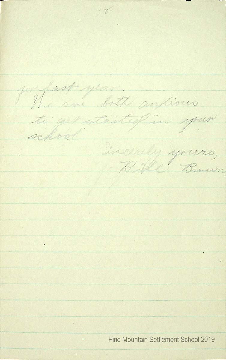 [014] August 17, 1928. Handwritten letter to Miss Pettit from W.T. (Taylor) Brown, Berea, KY, describing his arrangements to bring Rose and Bill to PMSS on his way to Harlan to teach. “The parents have agreed for Rose to go but not Bill. However, when I get home I think I can change their minds. I am anxious to see your school again.”