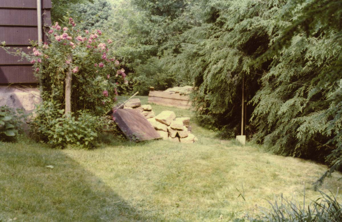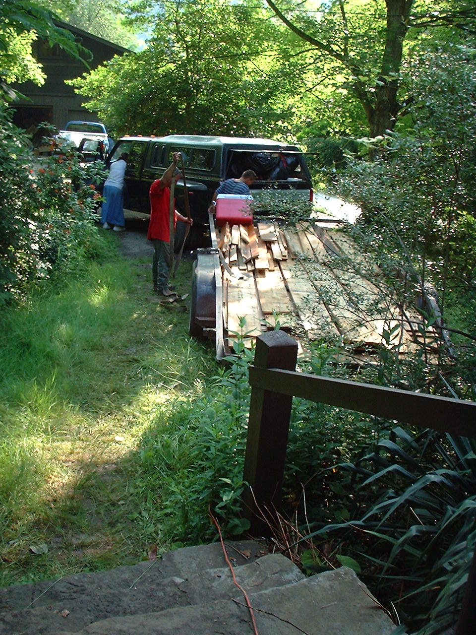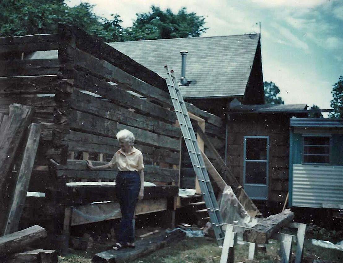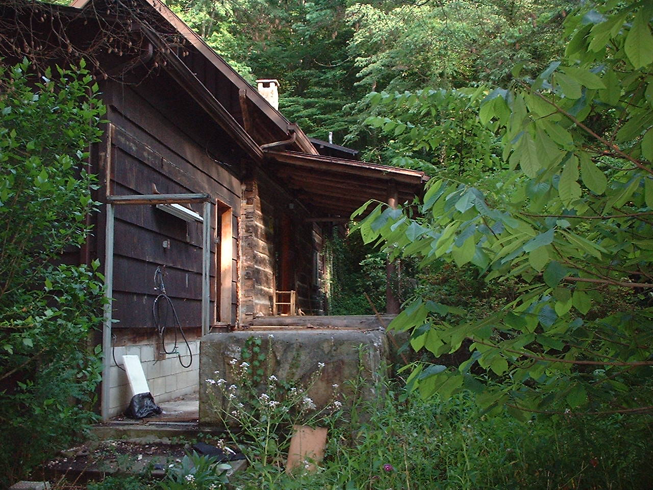 The structures were integrated during two building initiatives. While the first structure, comprised of two cabins, was under construction, a trailer served the needs of the kitchen and temporary bathroom. An upper basement and storage area with two outside entrances was attached to the back hillside of the now unified cabin. A room above the upper basement was added to serve as a bedroom and was joined with the upper attic of the cabin during this first phase of construction.