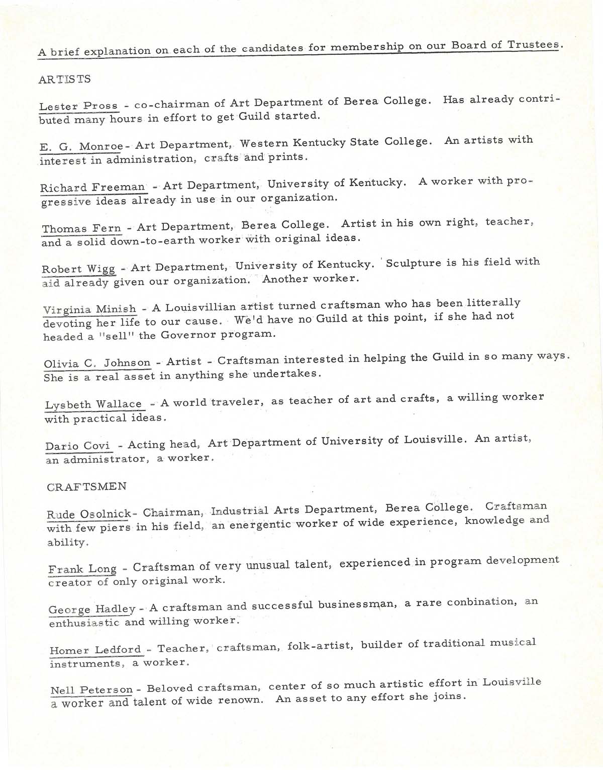 010-011 N.D. A two-page list titled “A brief explanation on each of the candidates for membership on our Board of Trustees,” providing names of artists, craftsmen, and administrative personnel and their positions, interests, and accomplishments.