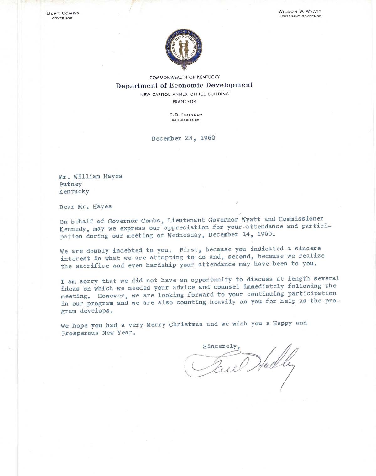 002 December 28, 1960. To Hayes from Hadley, expressing appreciation for Hayes’ participation at the December 14 meeting, sent on behalf of the Kentucky Governor, Lt. Governor, and Commissioner.