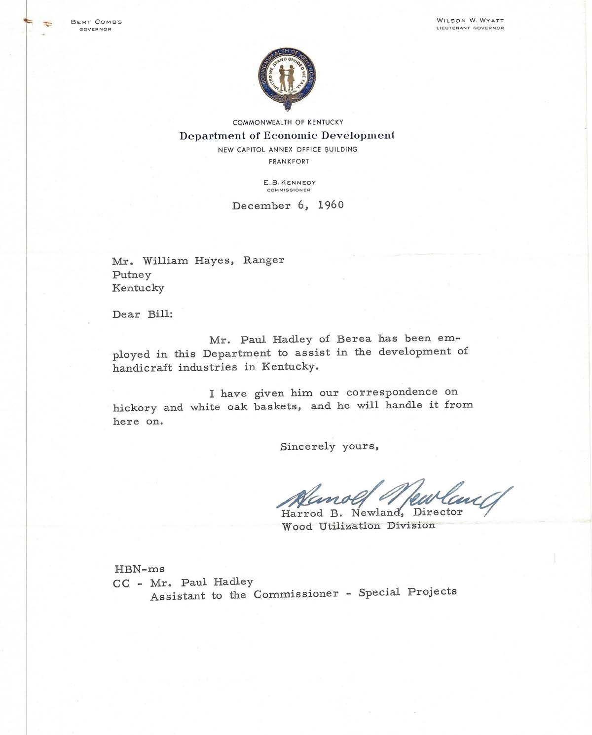 003 December 6, 1960. To William Hayes, Ranger, Putney, KY, from Newland, who reports that Hayes’ letter on hickory and white oak baskets has been handed to Paul Hadley, Assistant to the Commissioner – Special Projects.