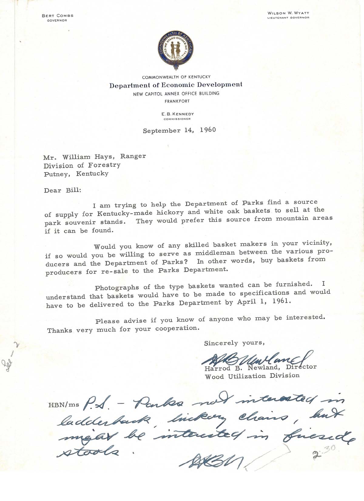 004 September 14, 1960. To Hayes from Harrod B. Newland, Director, Wood Utilization Division, Department of Economic Development, Frankfort, KY, asking his help in finding “a source of supply for Kentucky-made hickory and white oak baskets to sell at the park souvenir stands.” He also asks Hayes if he would “serve as middleman between the various producers and the Department of Parks.”