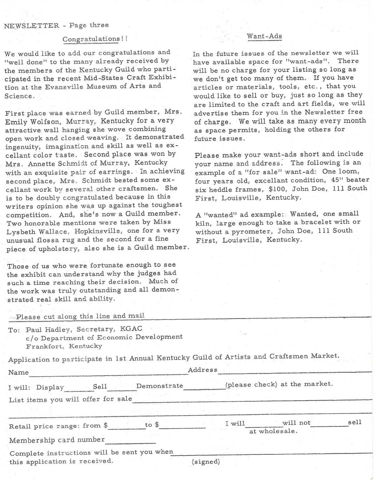 04 Page 3: Congratulations!! ; Want-Ads ; Application to participate in 1st Annual Kentucky Guild of Artists and Craftsmen Market.