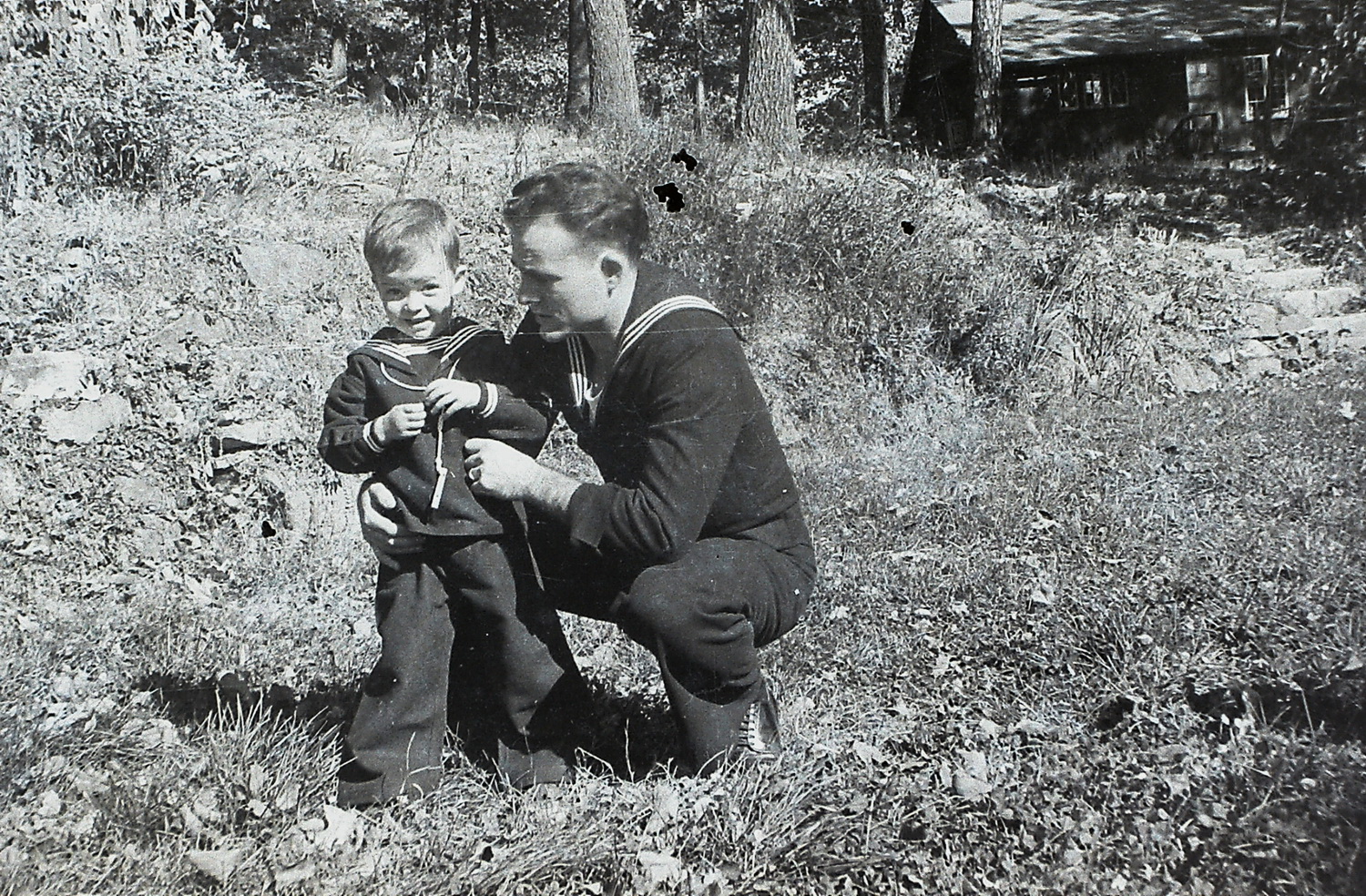 - William Hayes. At work on cabin steps while grand-daughter watches.