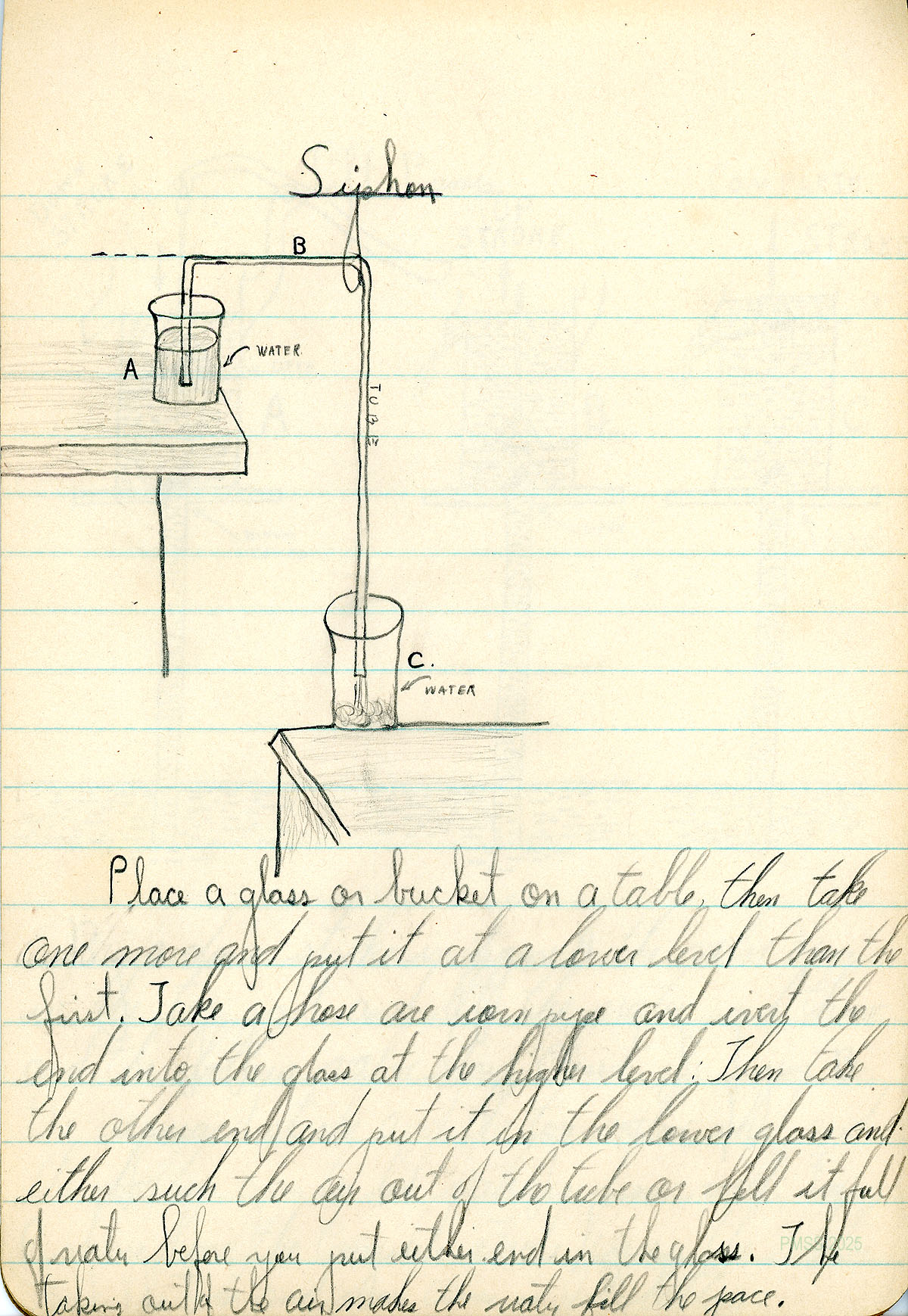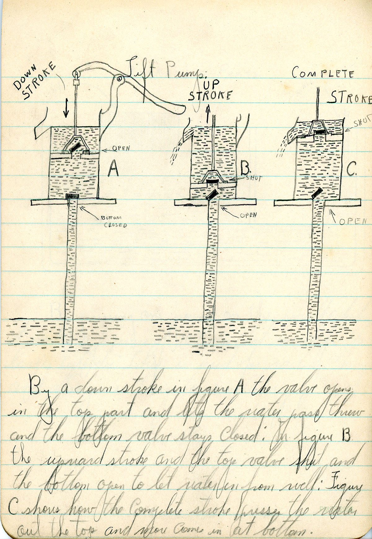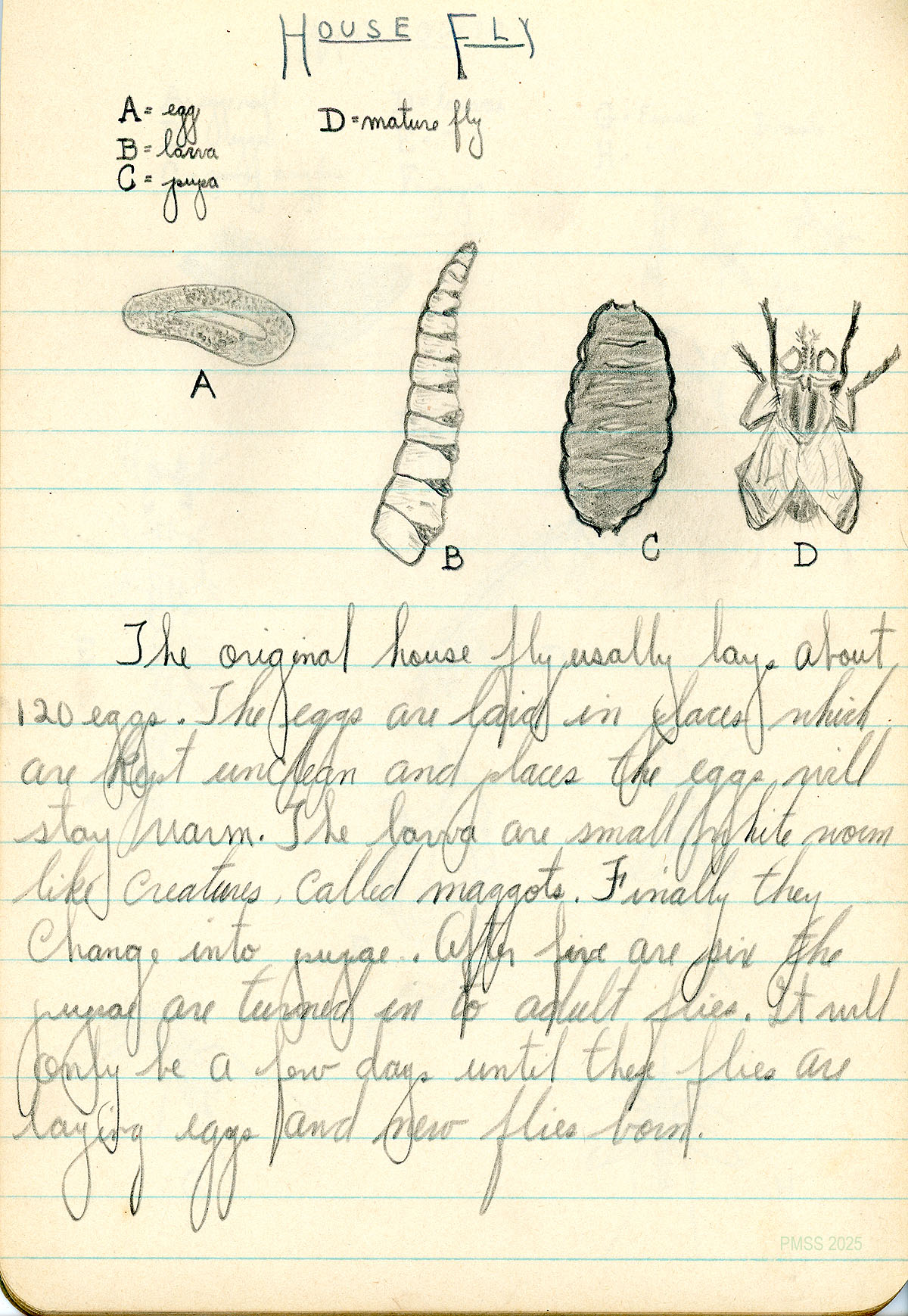 TAGS: William Hayes, Bill Hayes, classroom notebook, drawings, insects, water faucets, siphon, hydraulic press, Archimedes’ Principle, artificial ice machine, mosquitoes, house fly, literature, reading list
