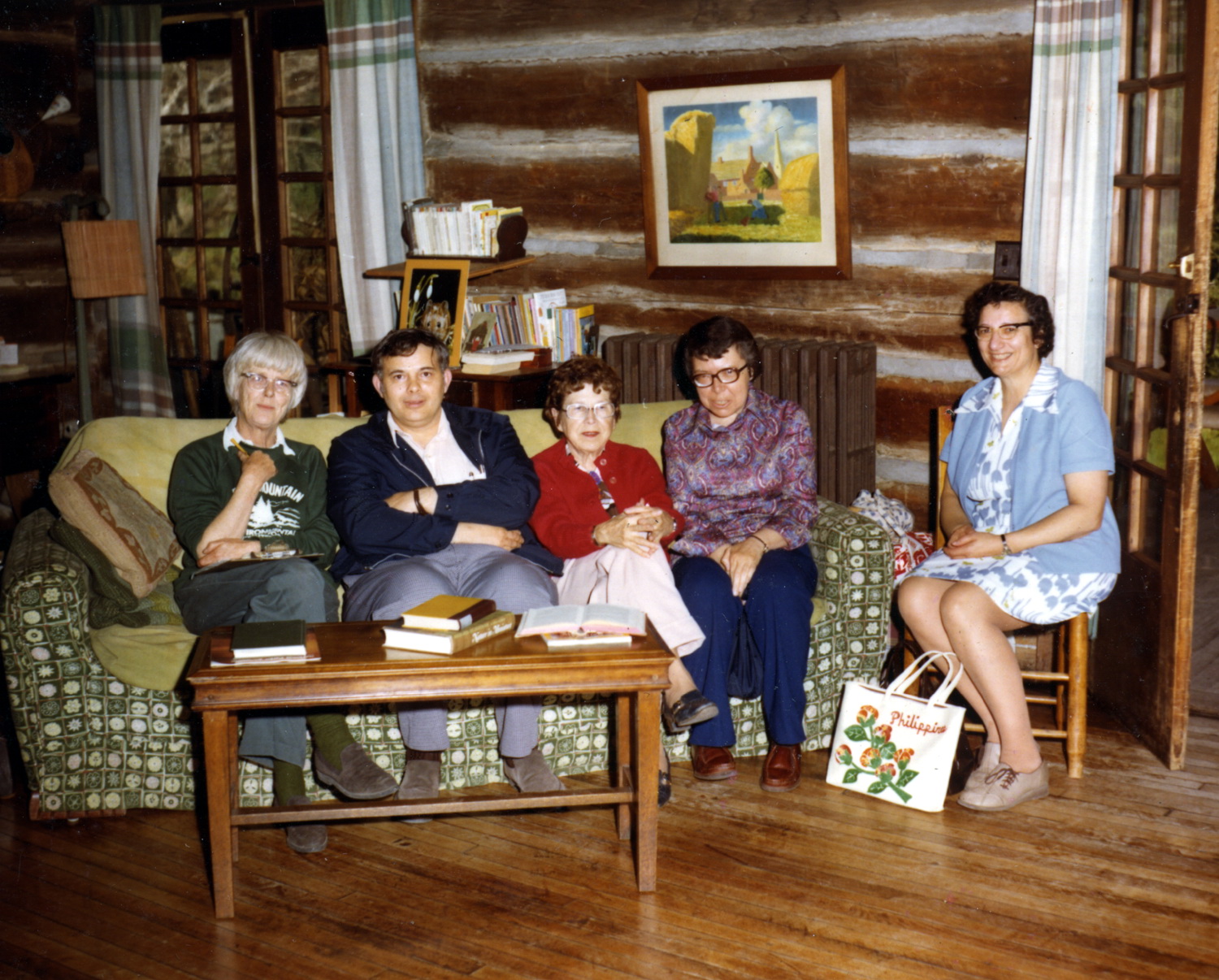 - (Left to right) Mary Rogers, Bill Leach, Alice Cobb, (?), and Milly Mahoney in living room of Big Log, c. 1970s. [X_100_workers_2657_mod.jpg]