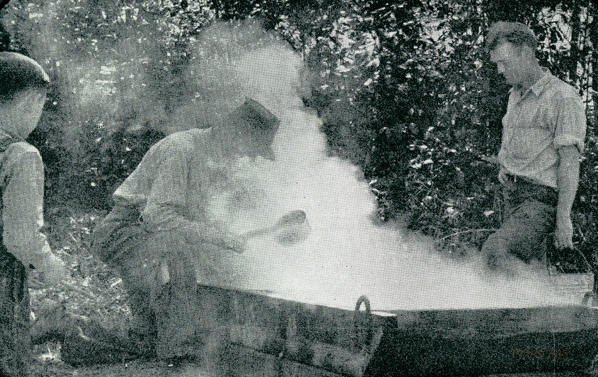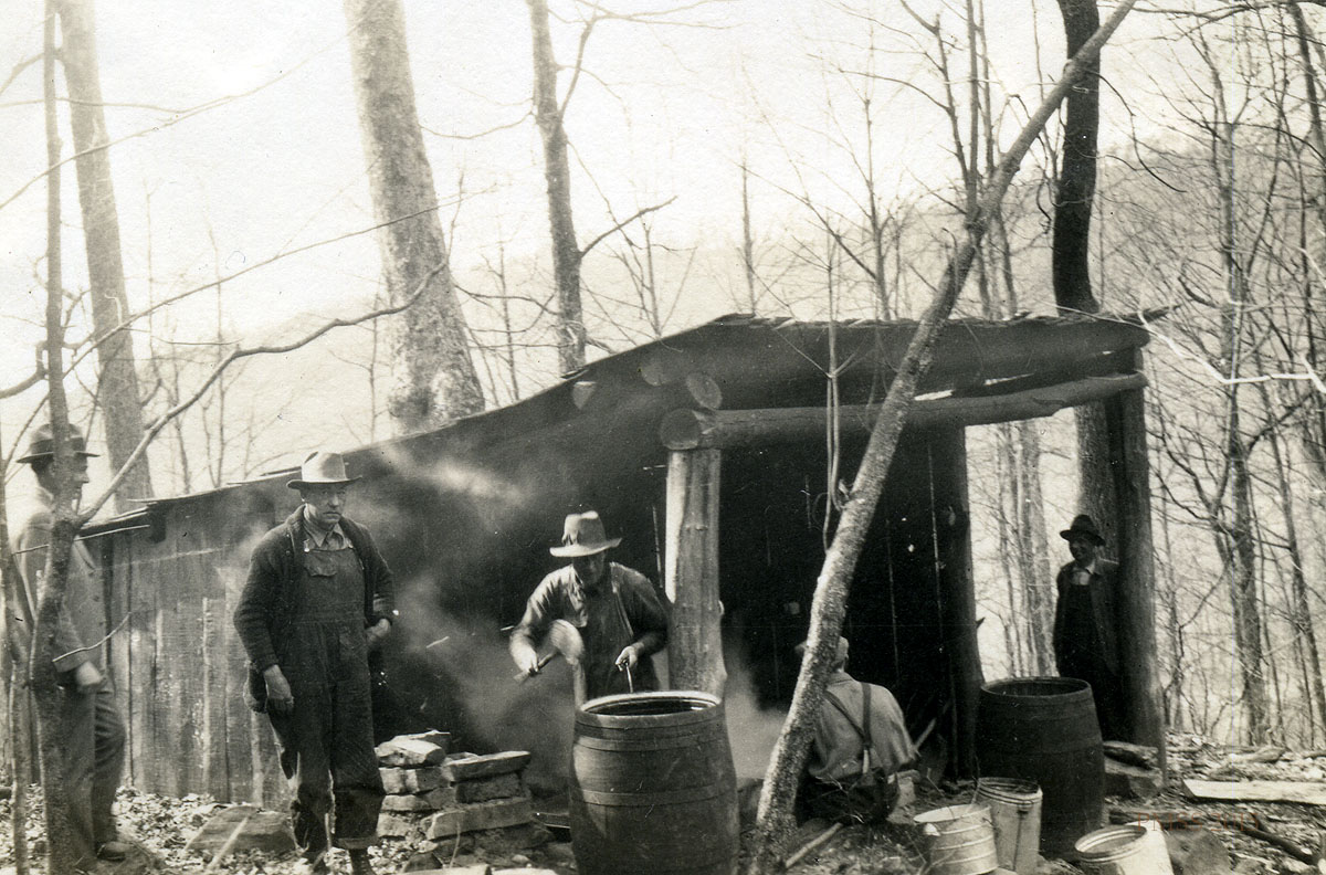 - “Bill Creech, Gib Lewis, Columbus [Creech], Henry [Creech] Stir-off.” Maple sugar stir-off at the maple sugar camp. [kingman_071c.jpg]