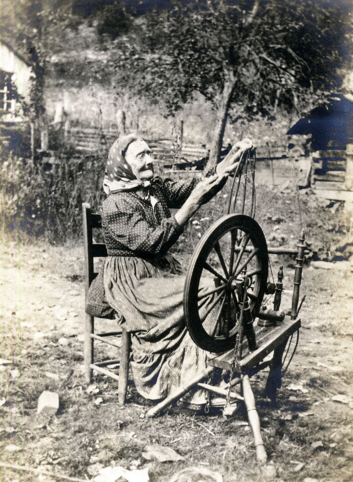 - “Aunt Sally Creech.” On back of photo: “Aunt Sal, wife of Uncle William Creech at her spinning wheel.” [kingman_079]