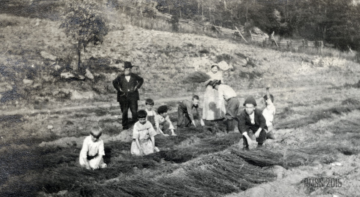 - 018a P. Roettinger Album. “Uncle William giving a lesson in spreading flax.” [William Creech, standing in back, and 9 children in the field.]