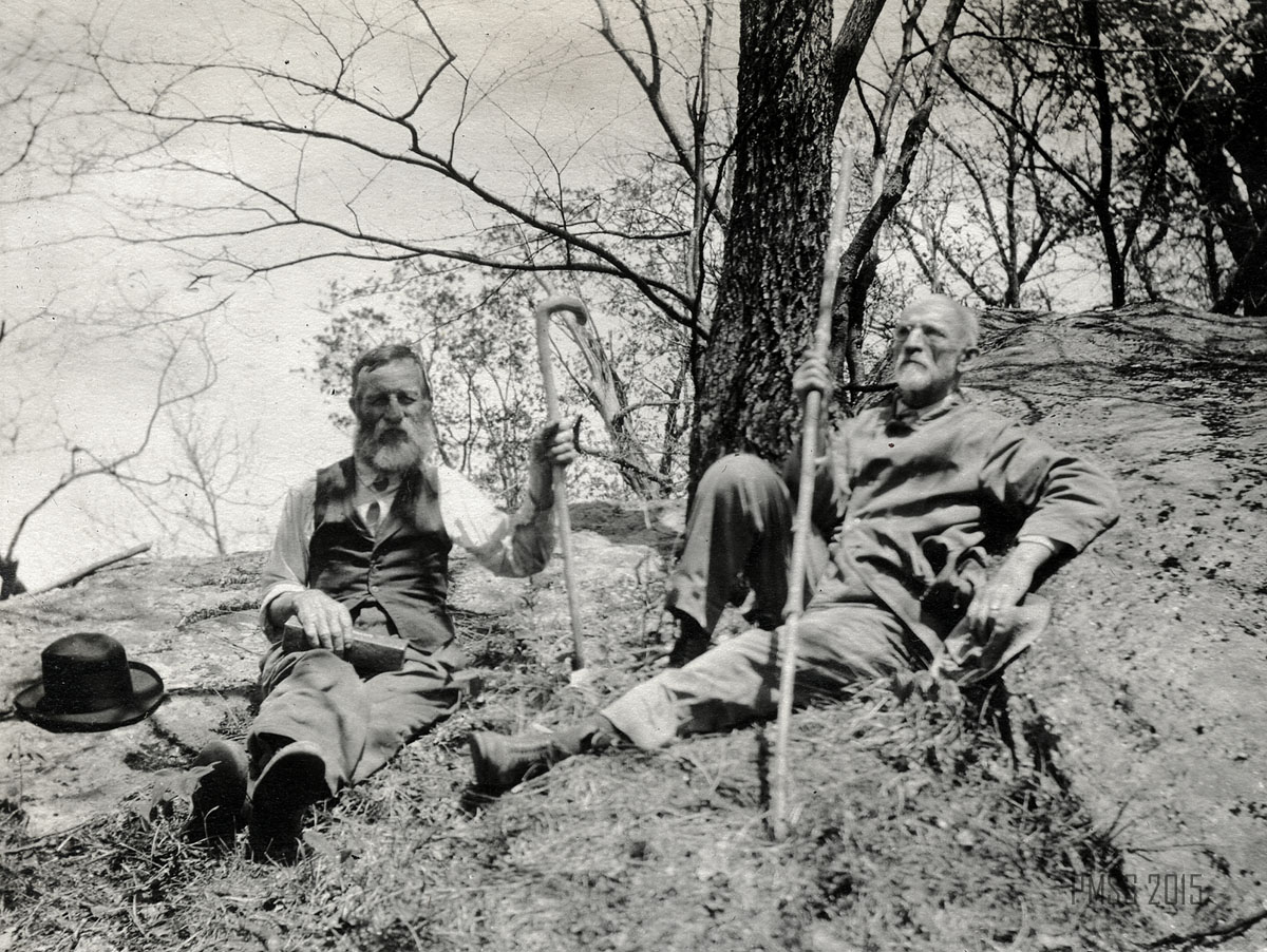 - 0056a P. Roettinger Album.”On the mountain top. Uncle Wm. Creech and “Old Mr. Man [Philip Roettinger]” [Two older men: William Creech and Philip Roettinger sitting, Creech on left holding a cane, hat on the rock at left, Roettinger at right holding a walking stick.]