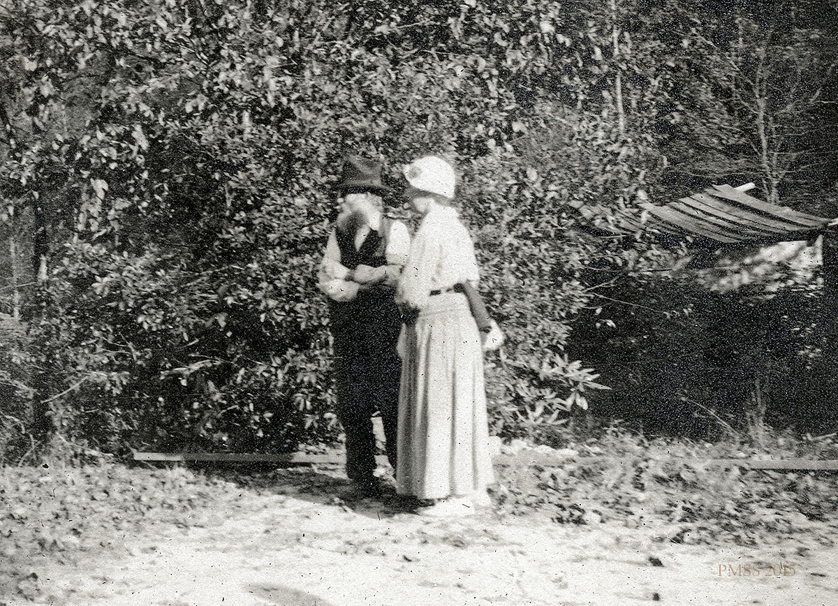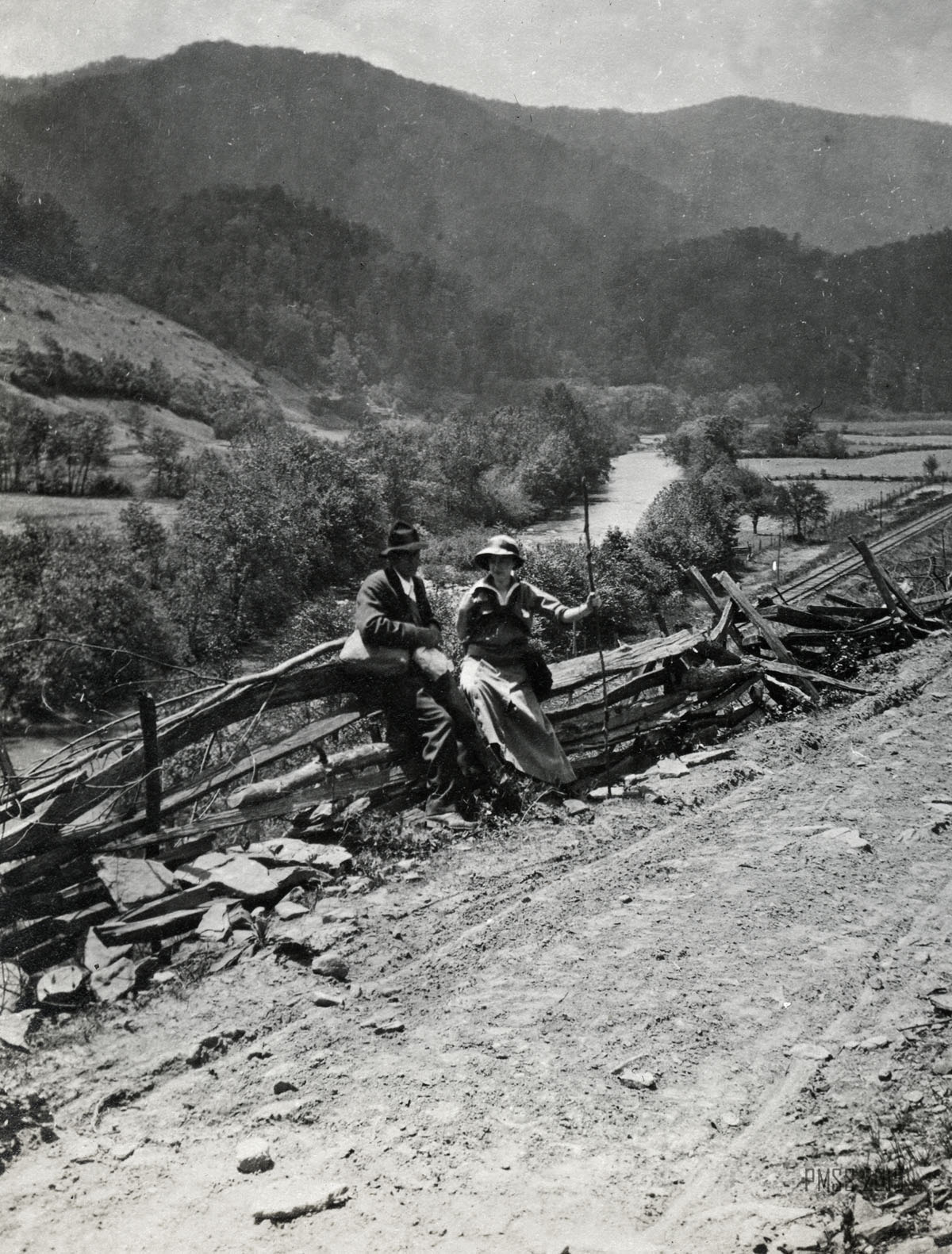 - Roettinger Album. “Columbus and Lizzie on the road to Hurricane Gap.” Elisabeth Roettinger, Columbus Creech. [Woman at left holding walking stick, man at right holding small parcel, walking down a trail.] [roe_068a.jpg]