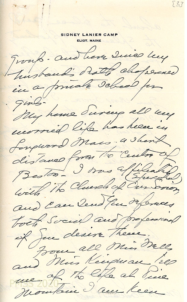 006-006c July 13, 1931. Three-page letter to Mr. Morris from Winifred Powell (Mrs. Wm Ackland Powell). [006] At the advice of “my dear friend and co-worker, Evelyn Wells,” Powell provides details of her experience for the job. [006a] “…I have been hostess of our great house, which is a center where our young people congregate….the life here in our rural community is much like that at Pine Mountain…. In the Church of the Ascension in New [?]…I had a choir of children and a young girls’ discussion [006b] group and have since my husband’s death chaperoned in a private school for girls.” Has lived in Lampwood, MA, near Boston, all her married life; Miss Wells and Miss [Marian] Kingman have told her about PMSS and she is [006c] “keen about the place and the splendid opportunity for service that it offers.”