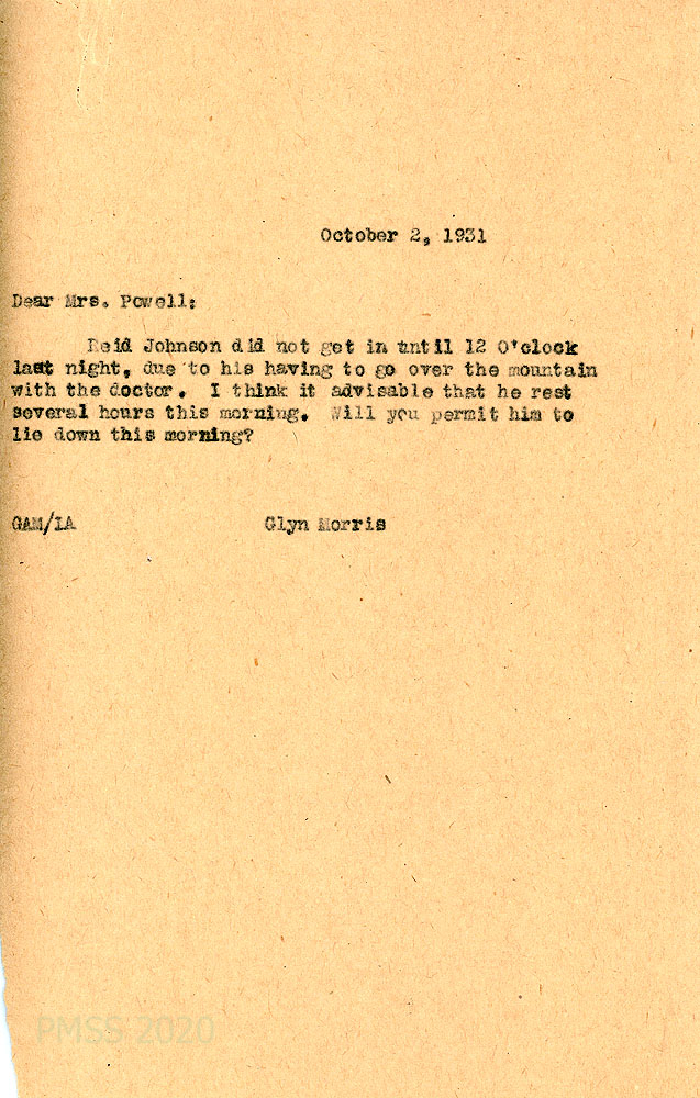 011 October 2, 1931. To Mrs. Powell from Glyn Morris, who asks her if Reid Johnson could rest because he came in late the night before, having been with the doctor “over the mountain.”