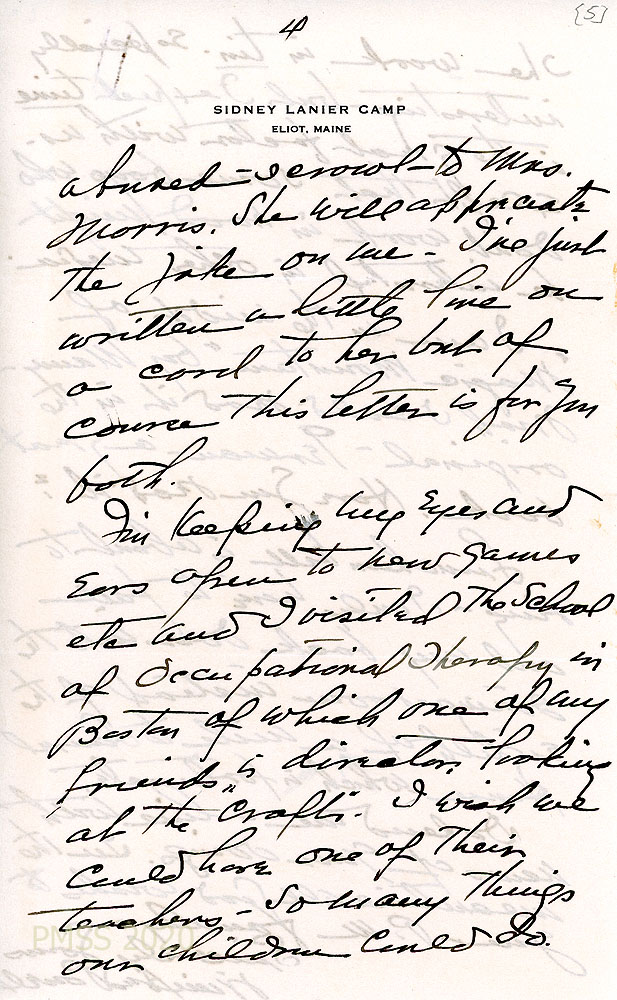 012-012e July 6, 1932. Six-page letter to Mr. Morris from Powell at Sidney Lanier Camp in Eliot, ME, who [012] discusses gardening issues and mentions John Hont. Asks to borrow one of the blue ballad books. [012a] Evelyn Wells will not be working at the camp this season; “cuts had to be made wherever possible.” John Lanier and an assistant have been doing folk-dancing, but “it’s a halfhearted performance, shorn of Evelyn’s magnetic leadership.” Met with “little Miss Aims” in Boston. [012b & c] Describes attending a performance by Helen Hayes with “Cousin” Idaline Aims. [012d] She is looking for new games, etc., and visited the School of Occupational Therapy in Boston to look at the crafts. [012e] Mentions a book she’s reading; asks for Pine Mountain updates.