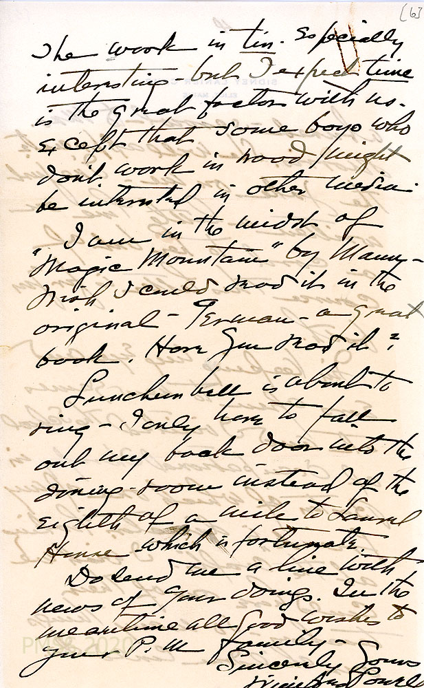 020-020f August 23, [no year]. Seven-page letter to Mr. Morris from Powell. [020] Discusses reading matter for ninth graders. [020a] Suggests that the Library class should meet more often than three classes weekly. [020b] “Even more important than the knowledge of some of the classes is the necessity of self-expression, both [?] and oral; refers to the way the French teach reading. [020c] “The idea seems to obtain here that all teachers should teach English if we are to make it functional, but that English teachers should confine themselves to English. That history should be taught by a history teacher with integrated programs.” [020d] Recommends “some comprehension of good poetry….” [020e] She “wants a place in the [?] for my Lib. class…. [020f] “…I understand English flunks more freshman than any other course here at M.U. The first two weeks of the freshman year is devoted to written work…” [missing last page(s)?]