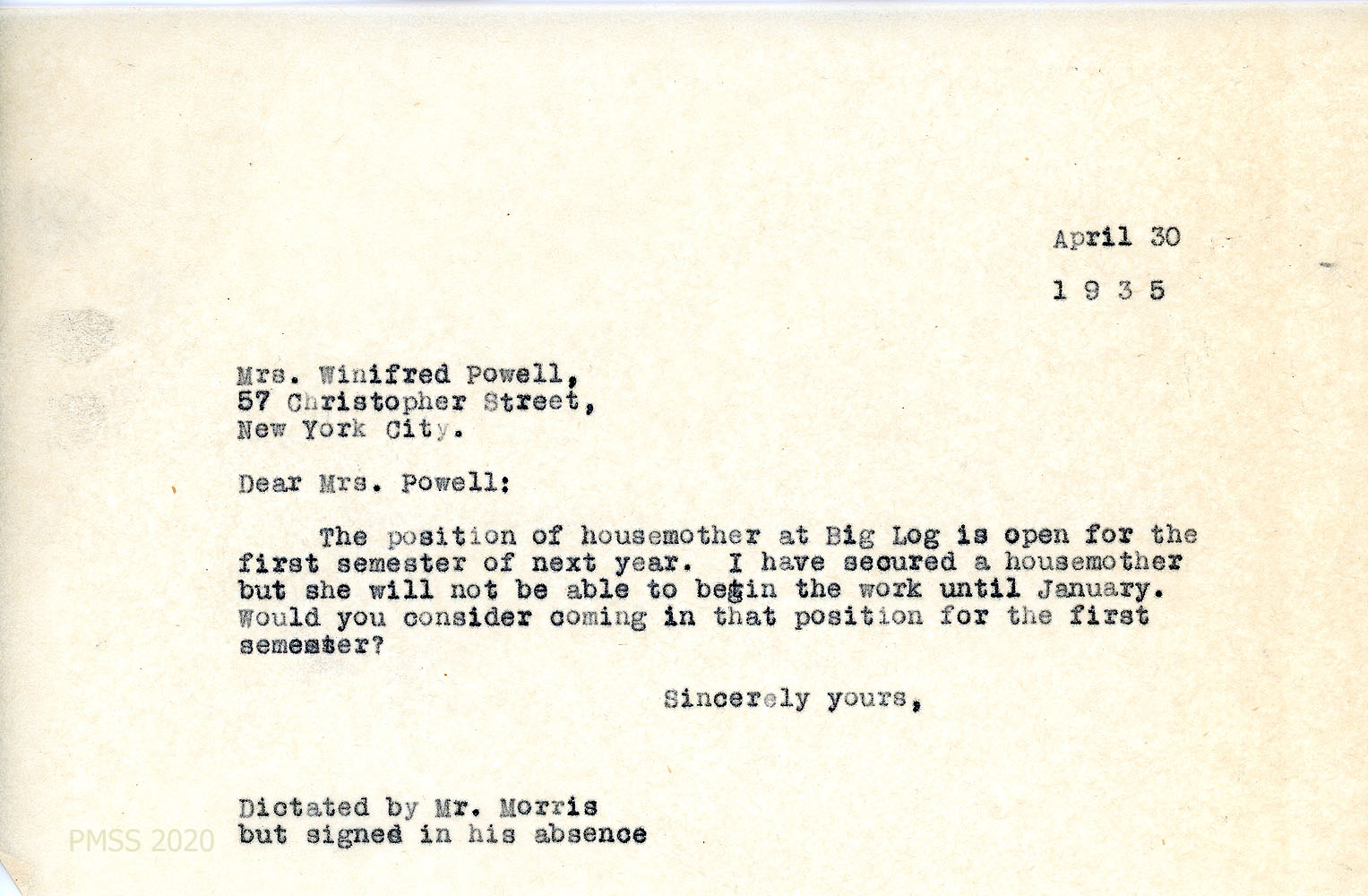 039 April 30, 1935. To Mrs. Powell from Mr. Morris, who asks if she would consider a housemother position at Big Log for the first semester of 1936.