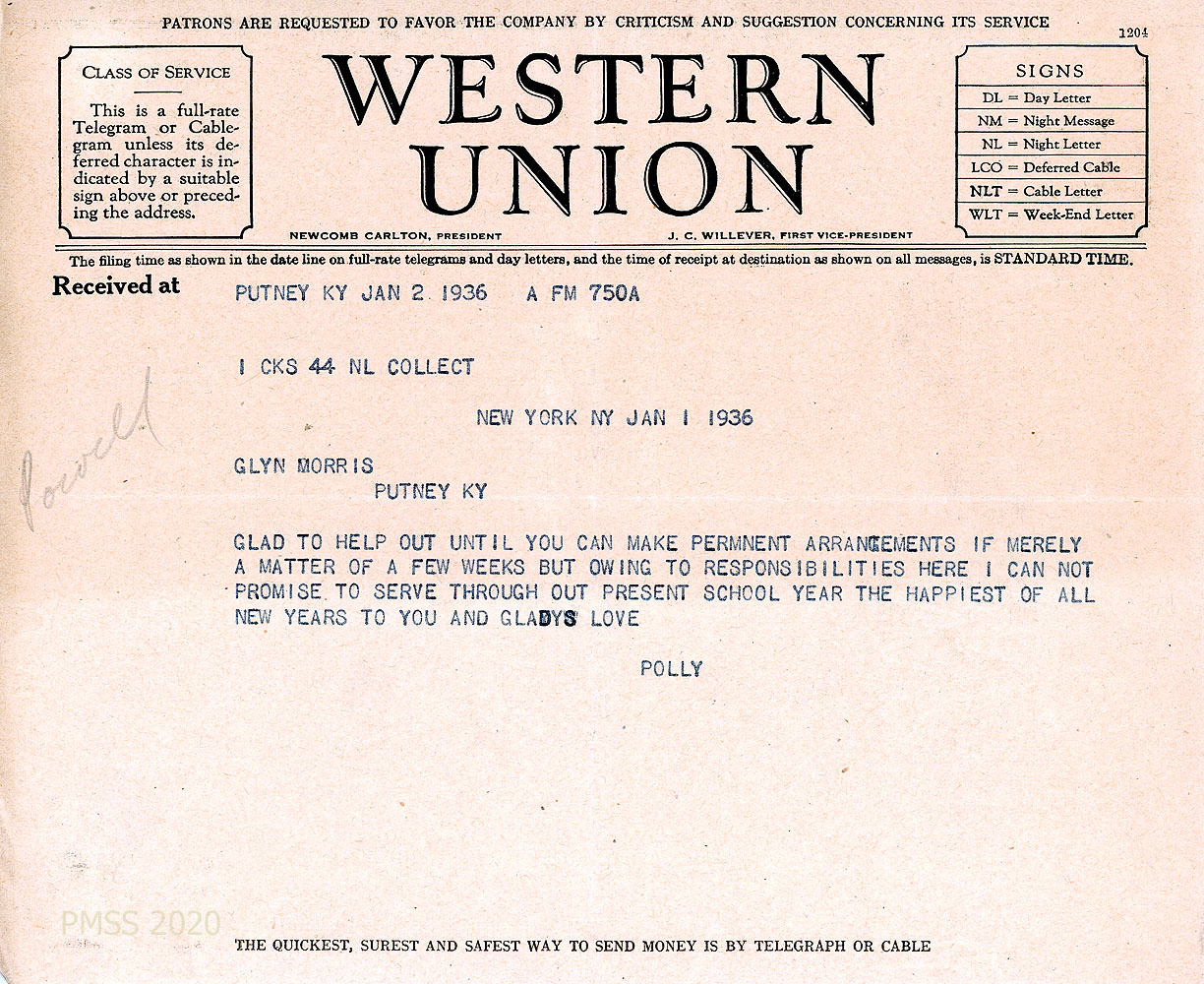 040 January 1, 1936. Western Union Telegram to Glyn Morris, Putney, KY, from “Polly” in NYC. “Glad to help out until you can make permanent arrangements….”
