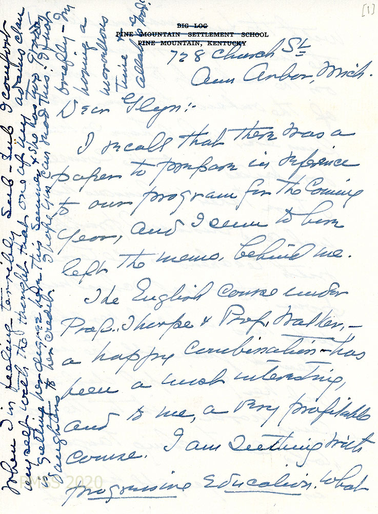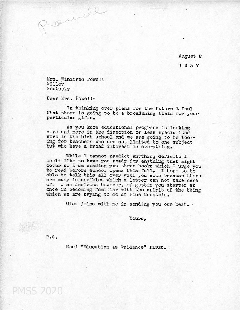 047 August 2, 1937. To Mrs. Powell in Gilley, KY, [Line Fork Settlement] from [unsigned, apparently Morris], who is sending her three books to read in preparation for her possible teaching in the fall. “As you know educational progress is looking more and more in the direction of less specialized work in the high school and we are going to be looking for teachers who are not limited to one subject but who have a broad interest in everything.”