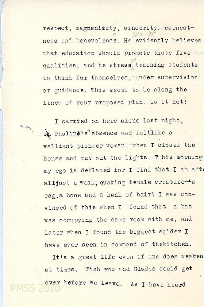 [Note: Letters from PMSS staff are carbon copies, typewritten, unsigned and meant for the Office files. The initials at the bottom left of some of the PMSS letters indicate the writer (along with initials of the secretary), such as “GAM,” the initials for Glyn A. Morris, PMSS Director. Miss Powell’s letters are handwritten unless otherwise noted. The following list of contents is in chronological order and not necessarily in order of the image numbers. Question marks in brackets — [?] — indicate illegible handwriting.]