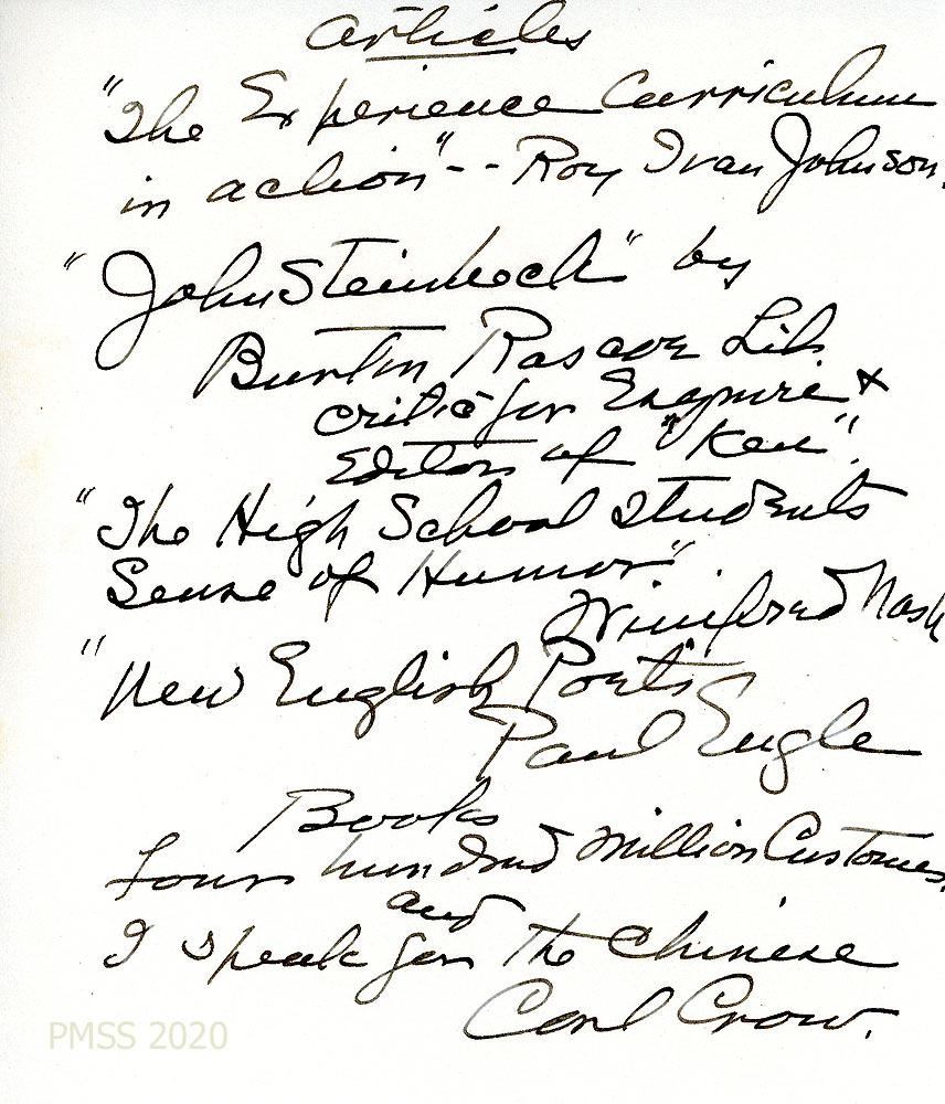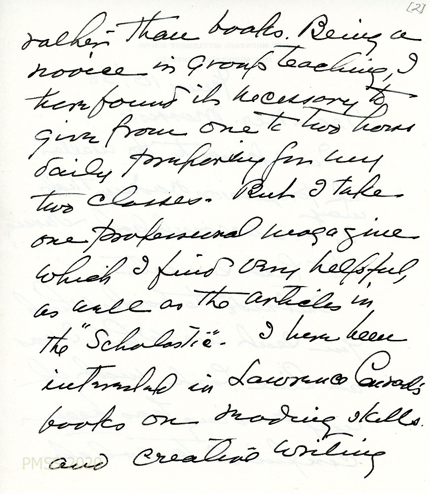 051-051b [?] 10, 1938. Three-page letter to Mr. Morris from Powell, [051] reporting on her professional reading in the last semester: the books he sent her and articles. [051a] Also, articles in the Scholastic magazine; Lawrence Conrad[?]’s books on reading skills and creative writing; [051b] and articles on education in Atlantic Monthly. Asks for his recommendations for “anything that will develop or stimulate imagination and also develop a sense of humor…. I fear these two attributes must be inborn???”