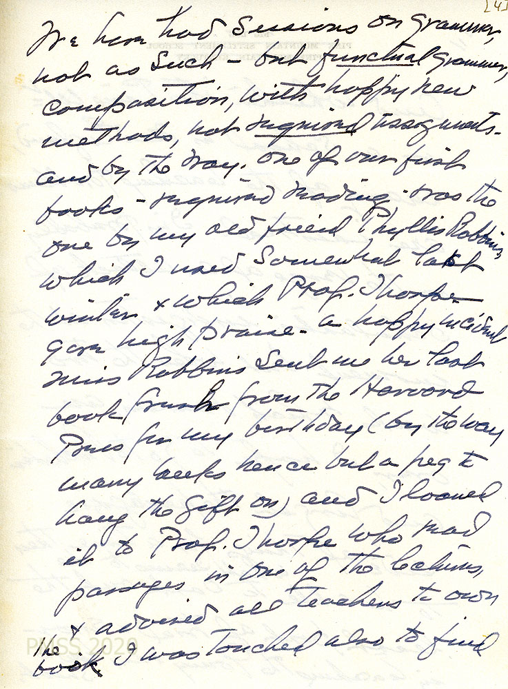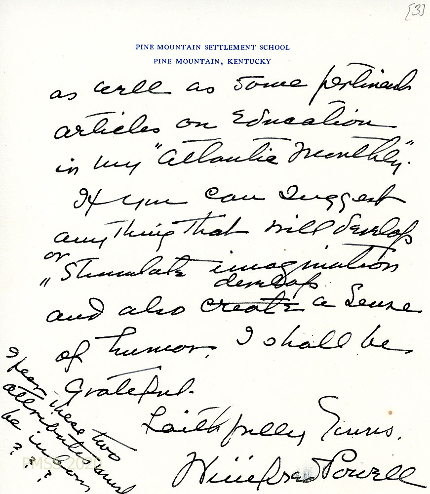 048-048b N.D. Typewritten three-page To “Glyn’ from “Mispal” (Powell) at The Cabin, Gilley, KY, who [048] is interested in Glyn’s tentative plan. “I find I don’t function well unless I have something definite to what I am pleased to “name” my mind. I have ever been beset by a desperate urgency to grow mentally. In my beloved adopted tongue — ‘C’est plus fort que moi.’ Hence, I feel that I would do a better job of house-mothering if I could fit into [your] scholastic plan.” She is reading a book he sent her; quotes from an article by Frederick Windsor, Headmaster of the Middlesex School, [048a] who “stresses teaching students to think for themselves, under supervision or guidance. This seems to be along the lines of your proposed plan, is it not!” [048b] Mentions the Bakers [Richard and Lutrella] coming around the 15th.