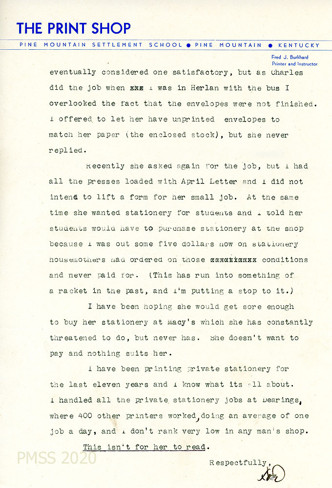 052-052a N.D. Two-page letter to Mr. Morris from Fred J. Burkhard, Printer and Instructor, on letterhead for The Print Shop, PMSS, [052] who describes a series of incidents concerning stationery purchases for which Mrs. Powell owed money and was never satisfied. [052a] He cites his eleven years of experience at “Dearings, where 500 other printers worked,…and I don’t rank very low in any man’s shop.”