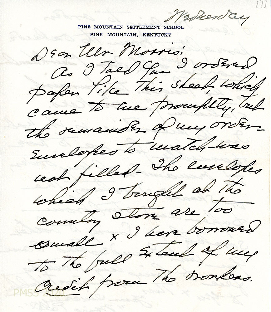 053-053a N.D., Wednesday. To Mr. Morris from “Miss Pal” (Powell), [053] describing her problems concerning stationary. [053a] “I am willing to order hereafter from the outside [?] if Mr. Burkhard is no longer to furnish stationery for workers.”