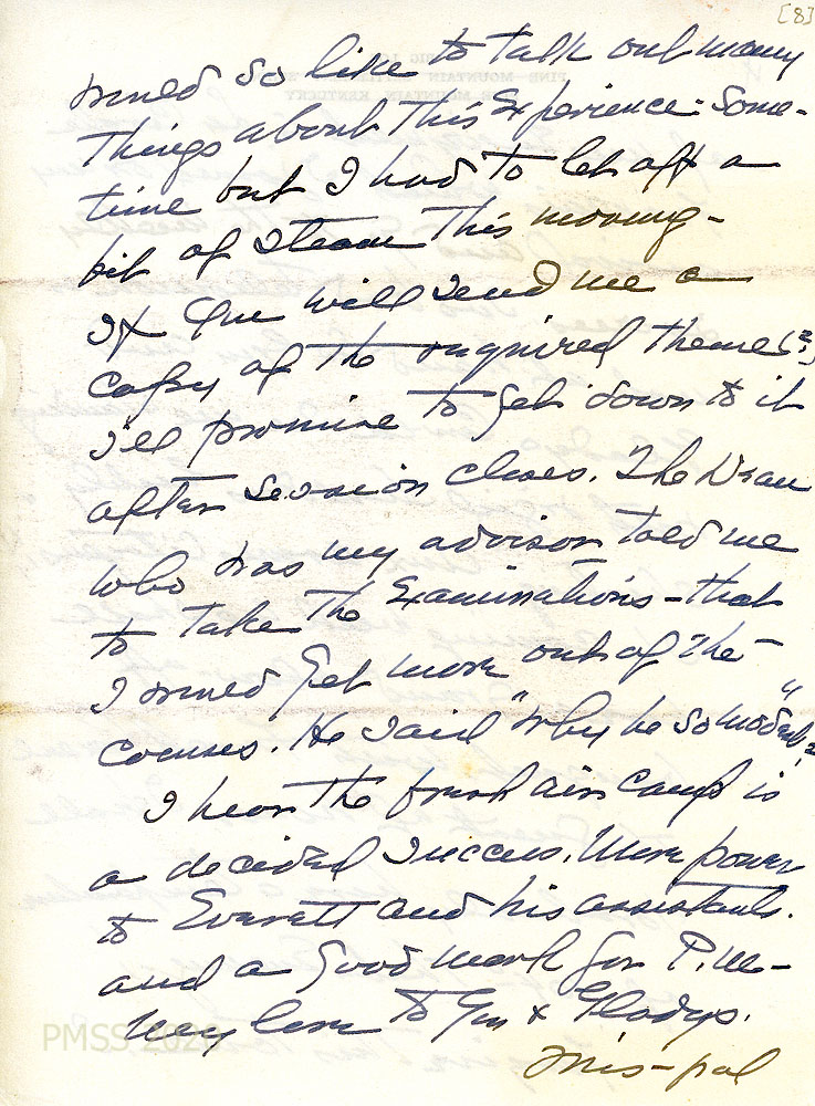 062-062g N.D. Eight-page letter to Mr. Morris from “Mis-Pal” (Powell). [062] Refers to an English course under Professors Thorpe and Walken that interested her: “I am seething with progressive education.” [062a] She has taken notes and discussed problems with a variety of teachers [062b] “and many of the teaching problems are identical.” [062c] Describes the subjects & books of the English course. Mentions a book by her friend, Phyllis Robbins that the professor read in class. [062d] The book has a picture of Nancy, her child. Describes studying Spanish with “Spanish Del Toro.” [062e] She is also attending classes in Shakespeare & Balzac [062f] and meets with a French group.[062g] Asks for a copy of his summer instructions to staff; Has heard of the success of the fresh-air camp and praises Everett [K. Wilson] and his assistants.