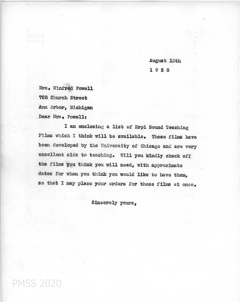 064 August 15, 1938. To Mrs. Powell from [unsigned, likely Morris]. Encloses a list of Erpi Sound Teaching Films, developed by the Univ. of Chicago; asks Powell to indicate which films she will need.