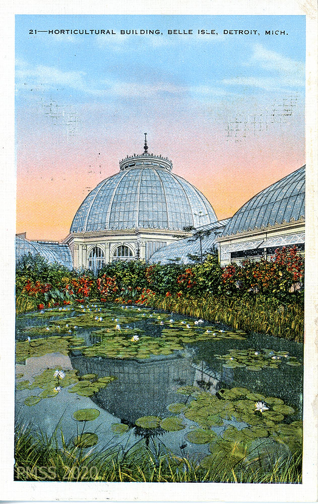 067-067a August 26, 1938. Postcard to Mr. Morris from W.P. (Powell), who [067 Address side] gives her date of arrival (via Cincinnati) in Harlan on September 7th. [067a] Image of “Horticultural Building, Belle Isle, Detroit, Mich.”