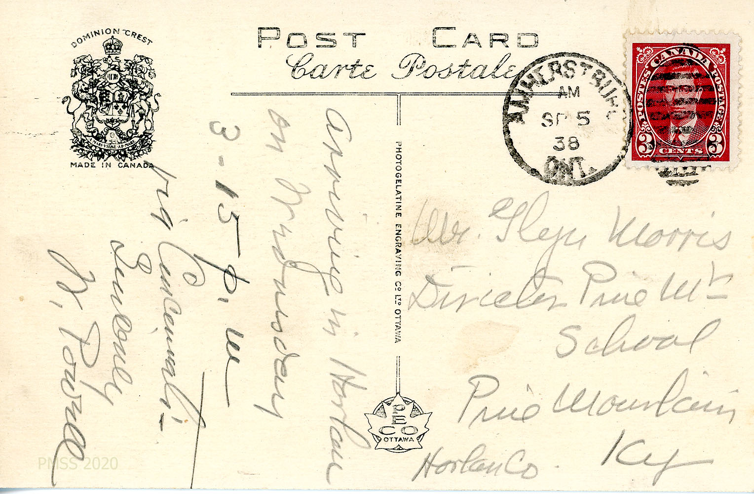 068-068a September 5, 1938. Postcard to Mr. Morris from W. Powell, [068 Address side] informing him of her arrival day and time. [068a] Image of “Christ Church…Amherstburg, Ontario, Canada.”