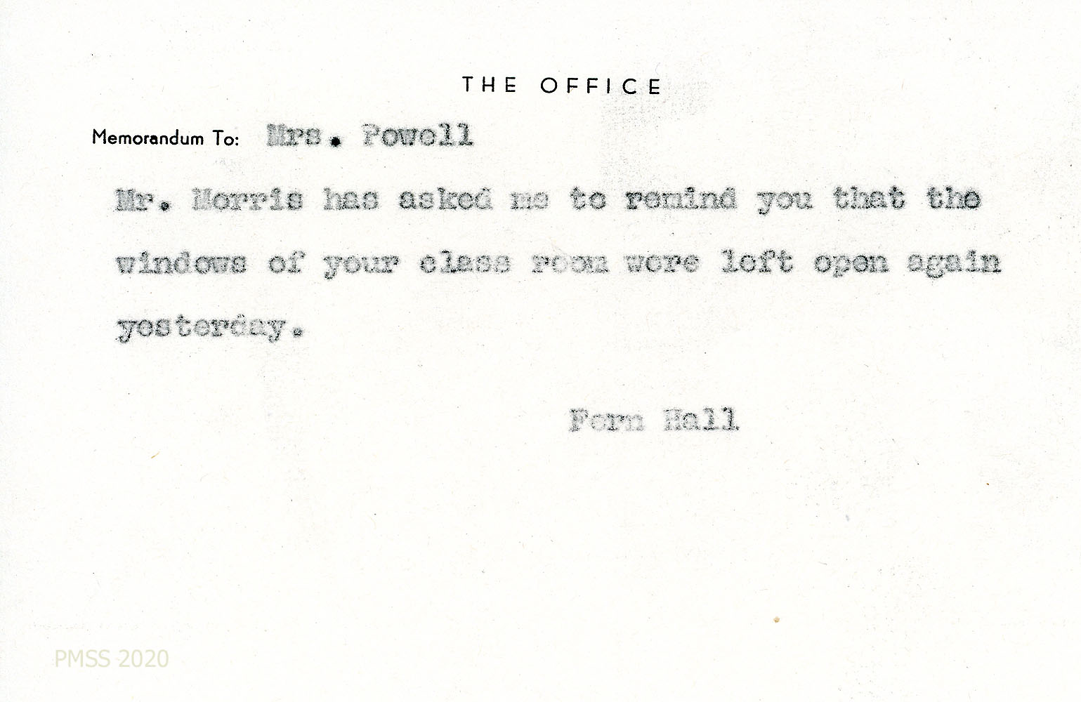 049 August 26, 1937. A copy of a short typewritten note to Miss Powell from [unsigned], stating that her “absence from the dining room this morning caused us some inconvenience.”