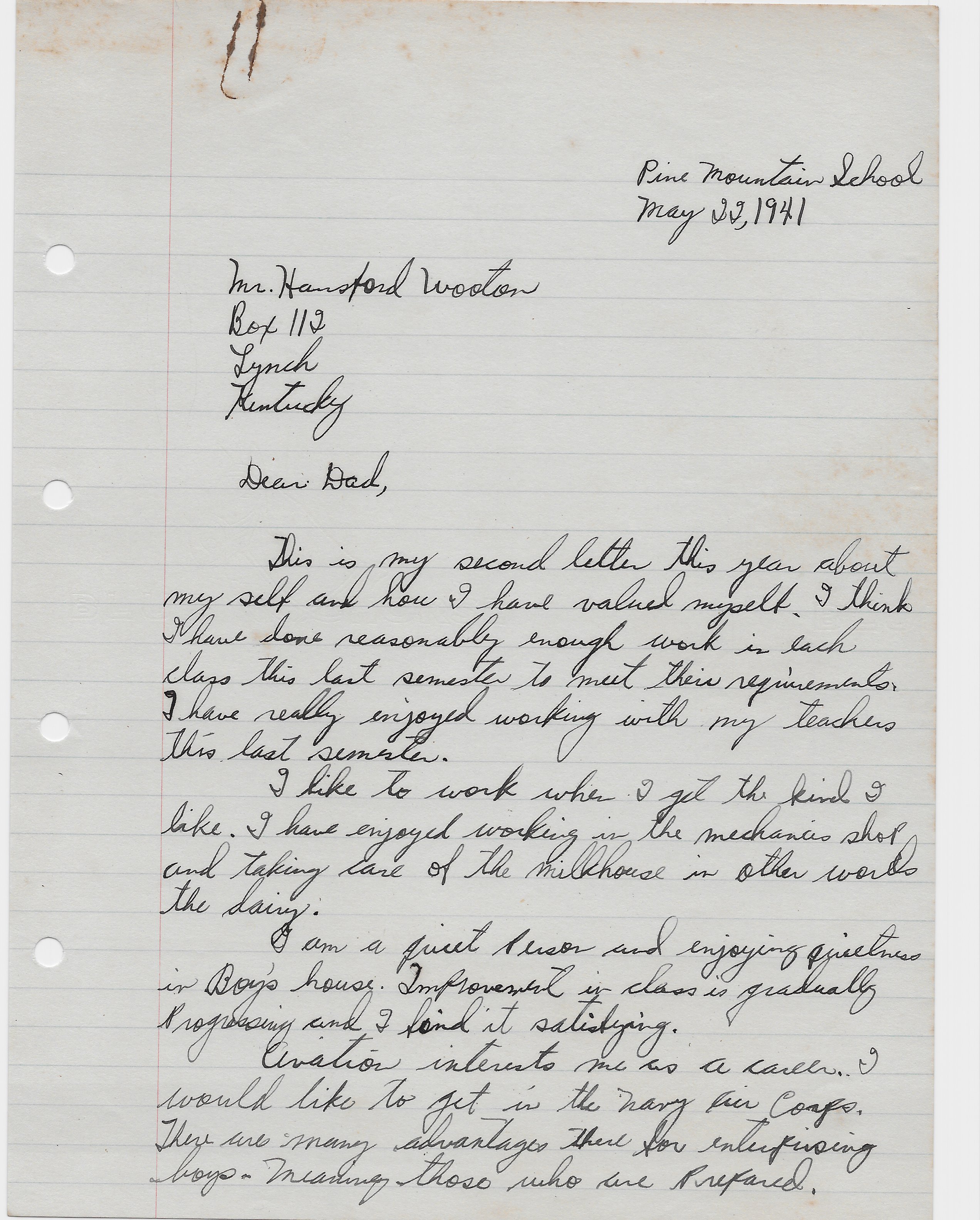 SCAN0314 and SCAN0315. May 22, 1941 – Two-page handwritten letter from Quinten Wooton to his father, Hansford Wooton, Lynch, KY.