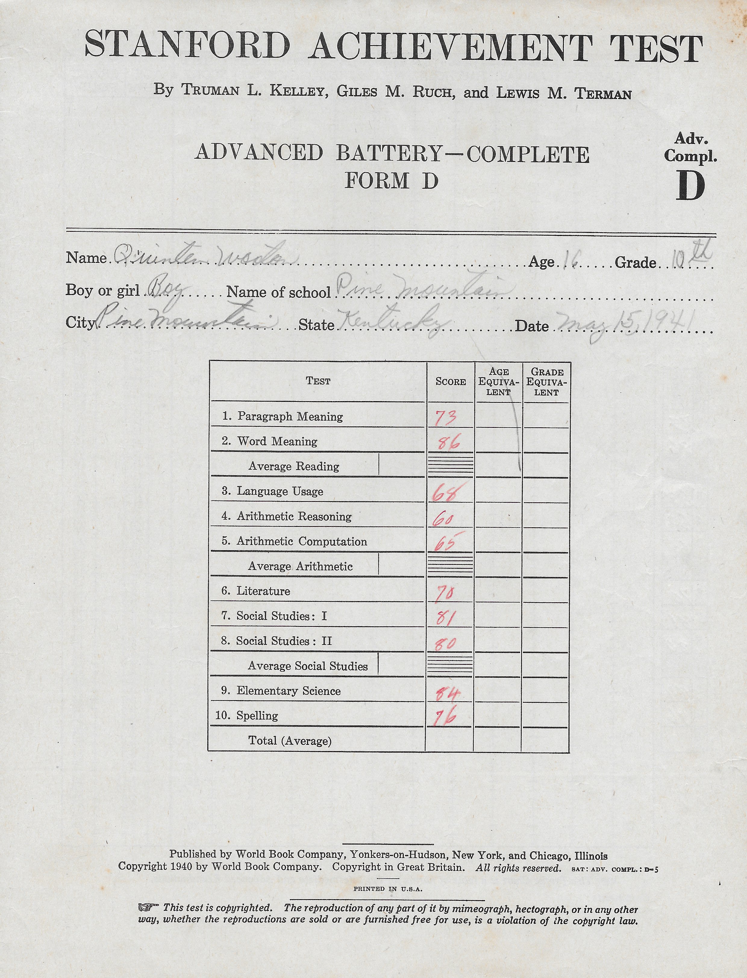 SCAN0223. May 13, 1941 – Stanford Achievement Test for Quinten Wooton, age 16, grade 10. List of 10 test subjects and handwritten scores.