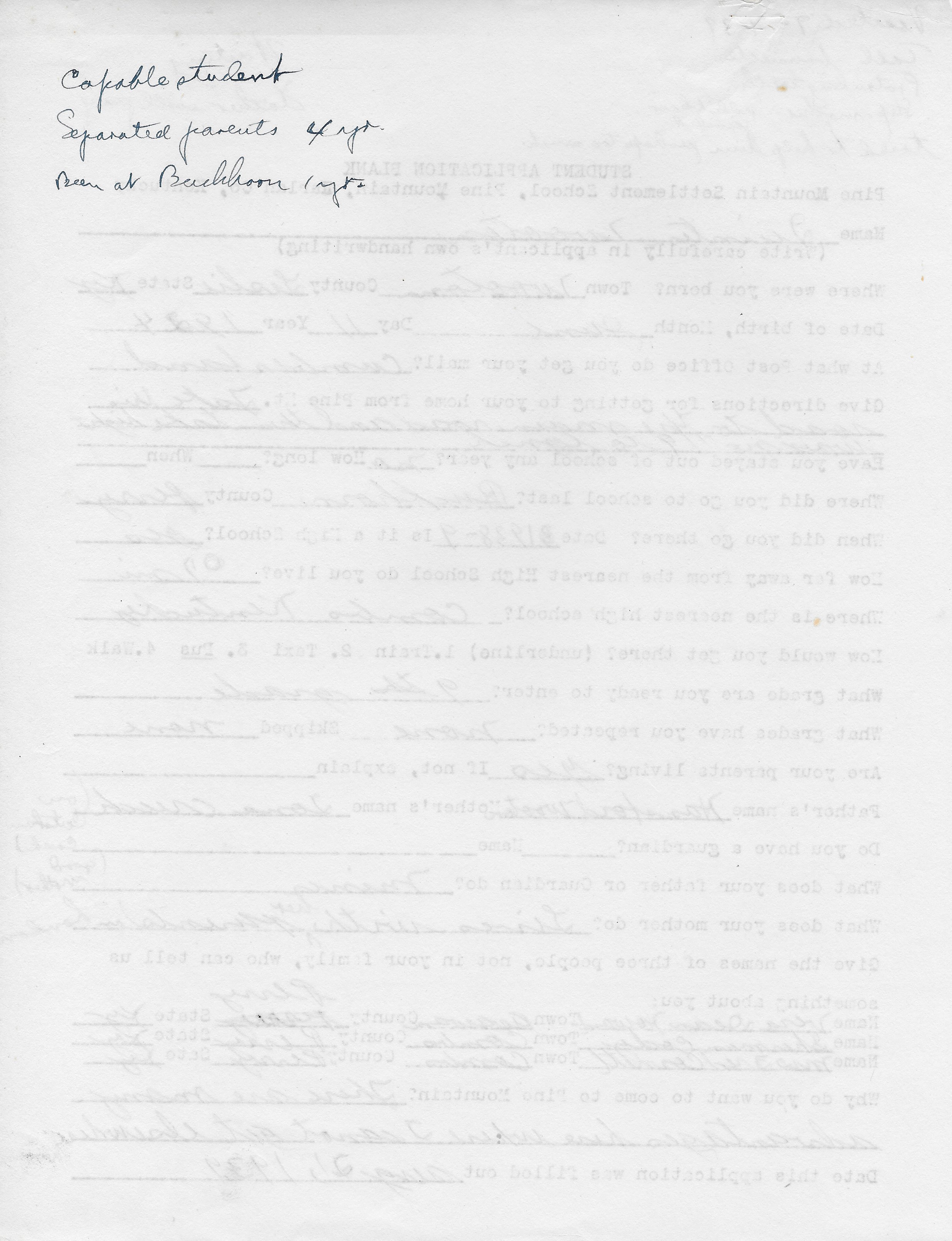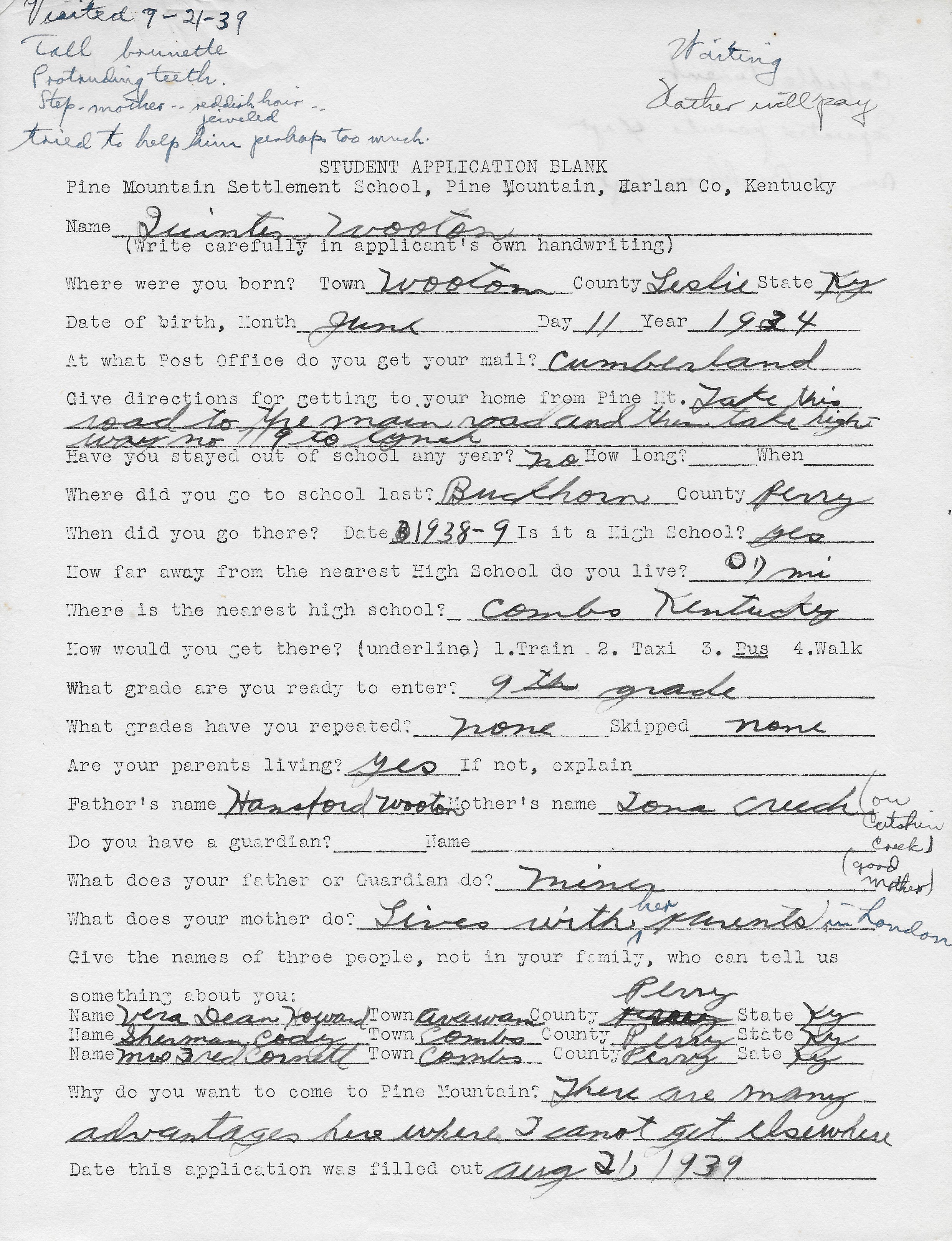 SCAN0279 and SCAN0280. August 21, 1939 – Student Application Blank with handwritten entries for Quinten Wooton. Born in Wooton, KY, on June 11, 1924. Last attended high school in Buckhorn, Perry Co., in 1938-39. Ready to enter 9th grade. Father: Hansford Wooton, a miner. Mother: Iona Creech who lives with her parents in London. [Notation: “On Cutshin Creek. Good mother.”] Why Pine Mountain: “There are many advantages here where I cannot get elsewhere.” [Notations on reverse side of Student Application Blank: “capable student; separated parents 4 yrs; [?] at Buckhorn 1 yr.”]