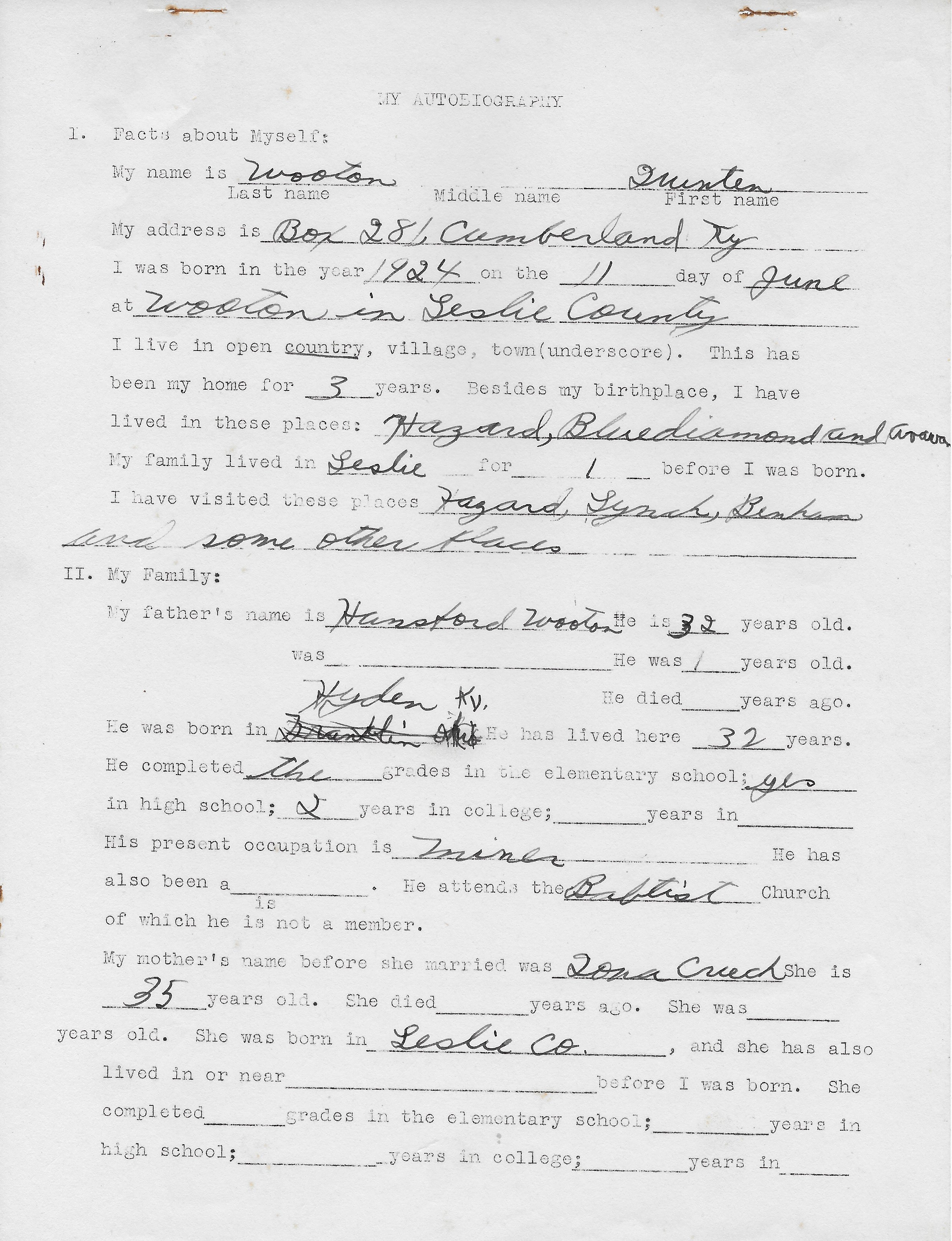 Born: 1924 June 11 at Wooton (Leslie County) & has lived there 3 years