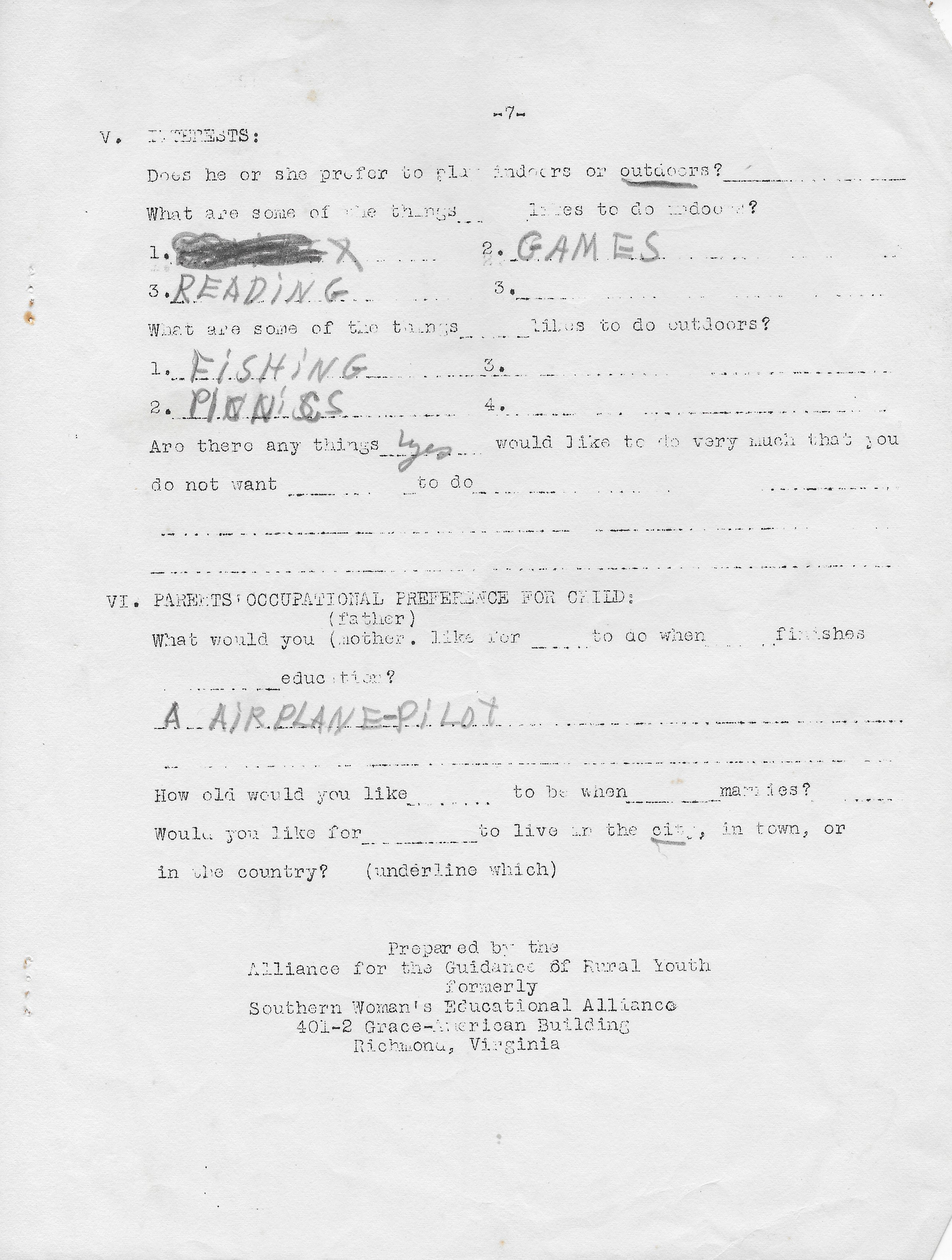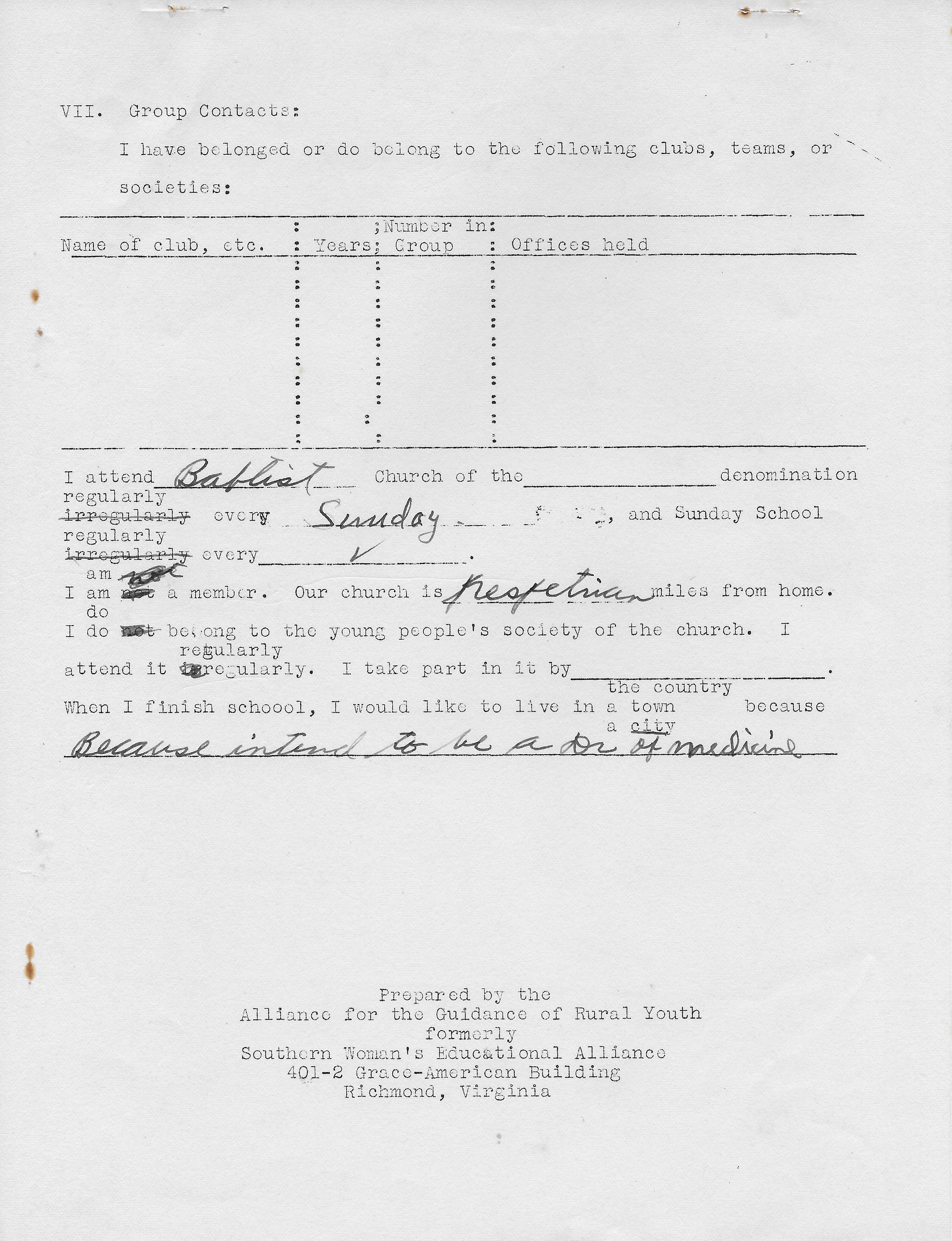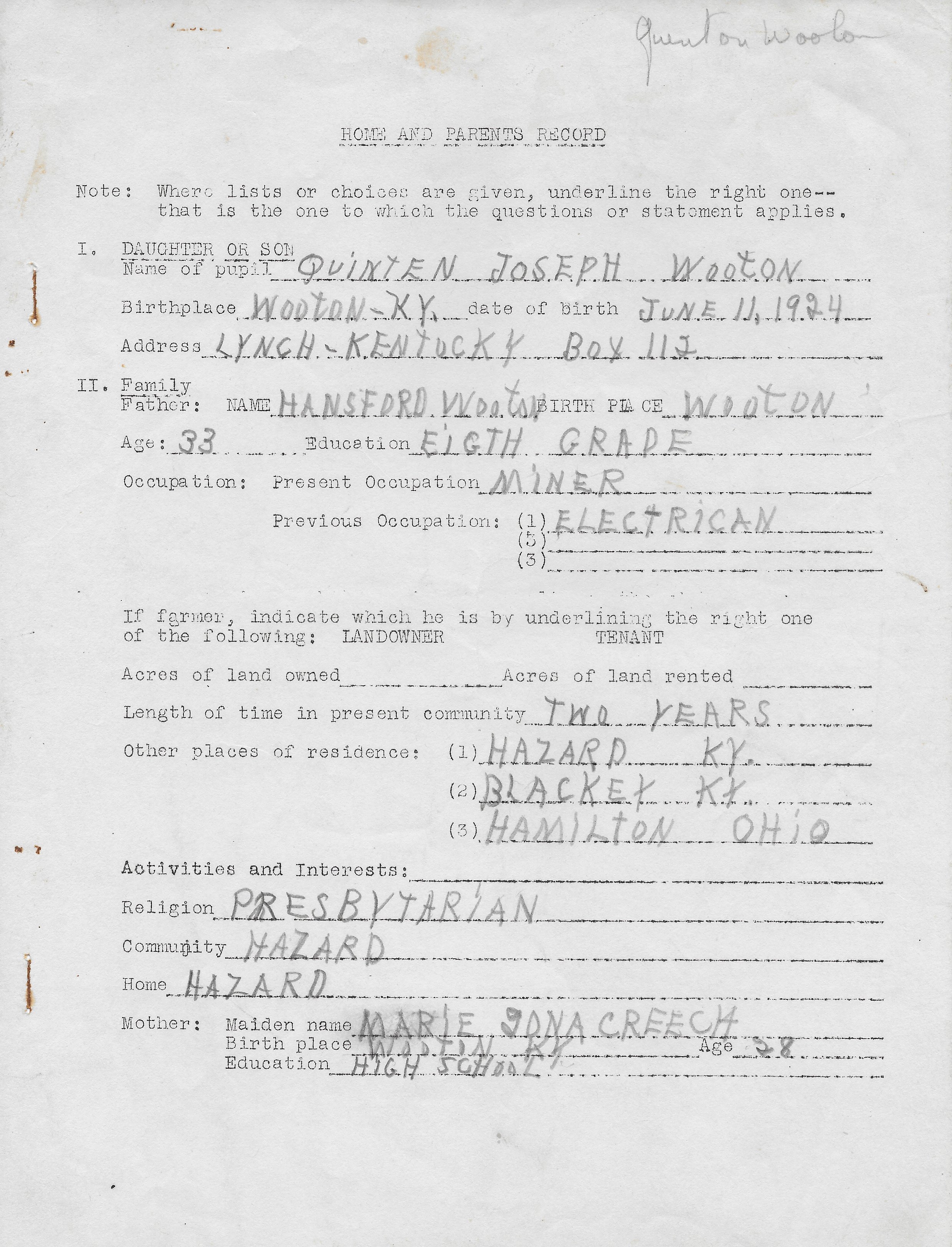 Quinten Wooton was one of several members of the Wooton Family who attended Pine Mountain Settlement School. He entered ninth grade in 1940 and stayed through June 1941. His reason for applying to the School, according to his entry on a Student Application Blank, was that “[t]here are many advantages here where I cannot get elsewhere.” He also stated on his application that the occupation he was interested in for himself was “Dr. of Medicine.”