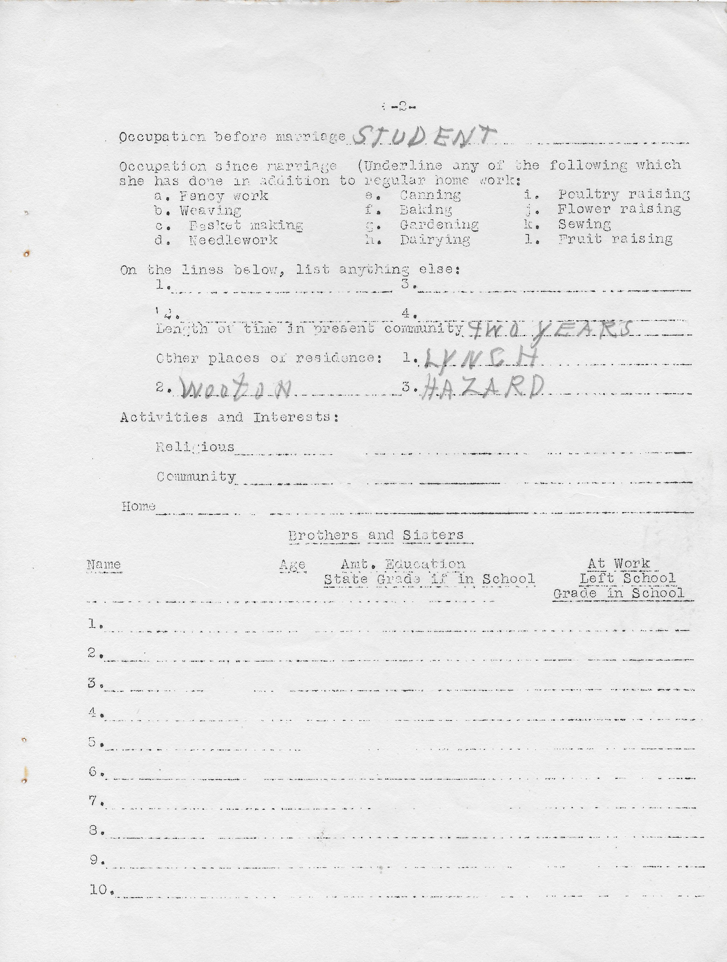 [Mother, continued] Occupation before marriage; student. Length of time in present community: 2 years. Also lived in Lynch, Wooton, Hazard.
