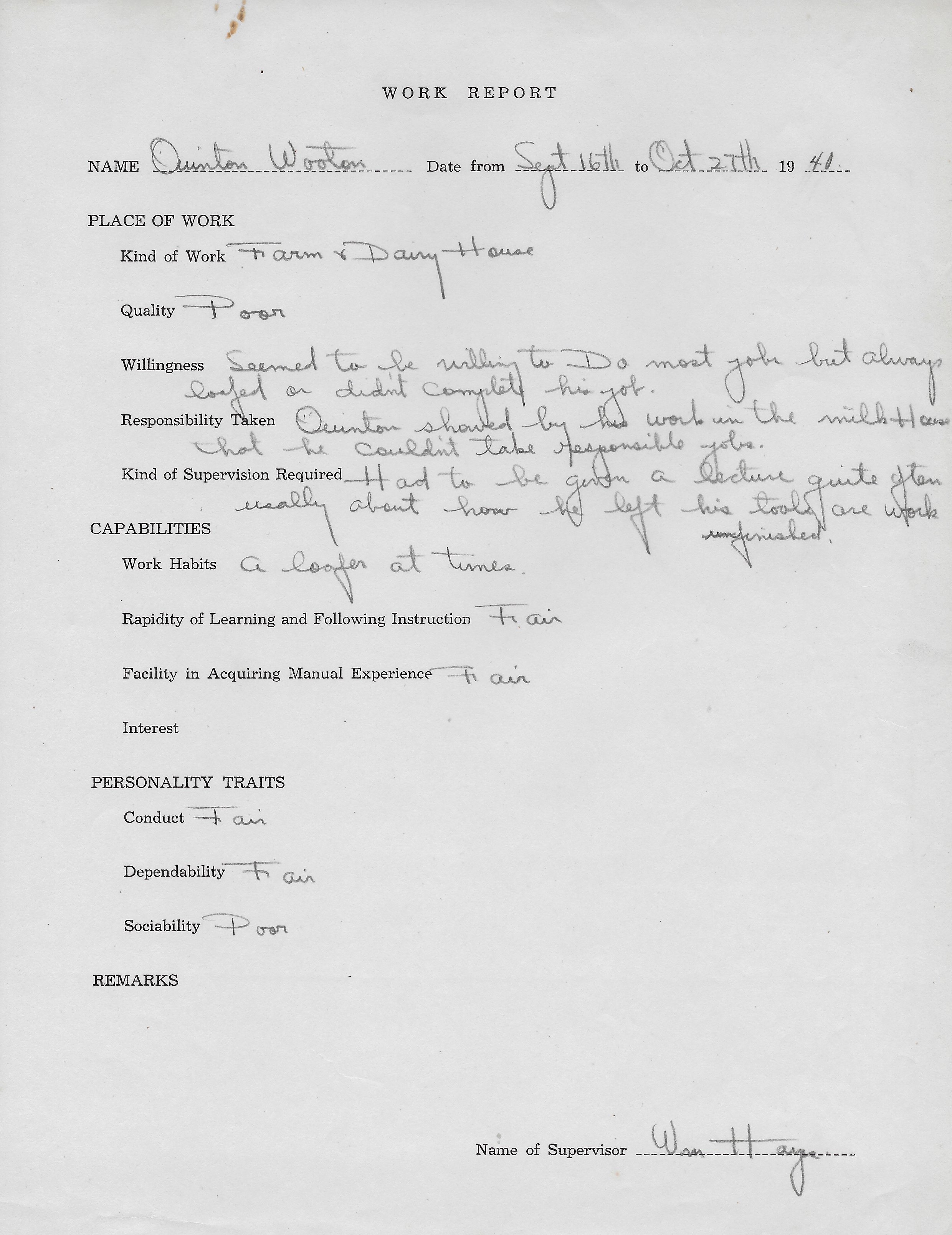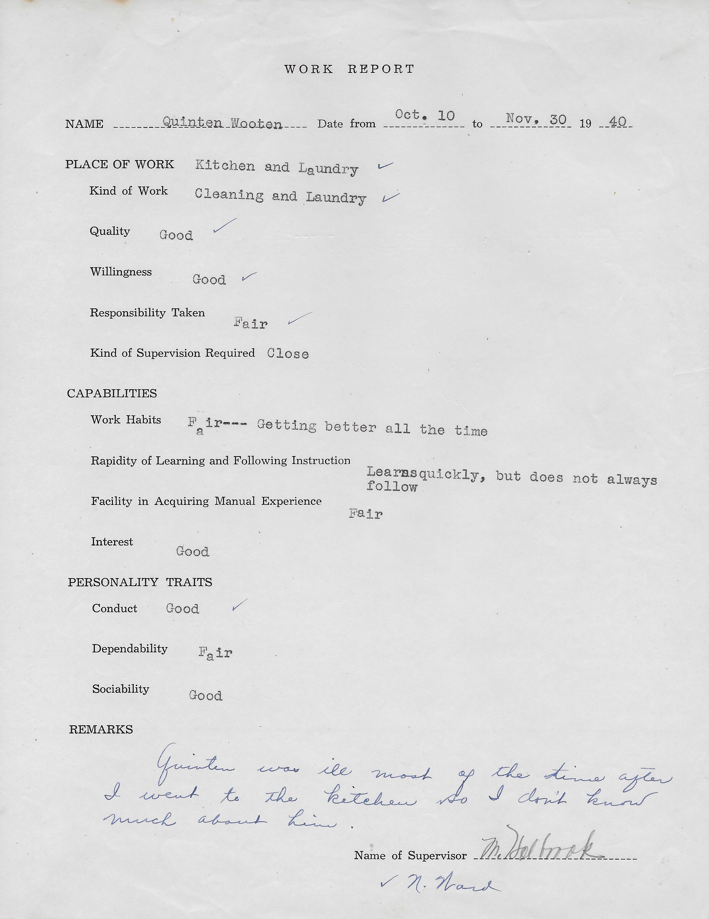 SCAN0295. Work Report for Quinten Wooton for Oct. 10 to Nov. 30, 1940. Supervisor: M. Holbrook with Remarks by N. Ward, Laundry and Kitchen. Work Habits: “Fair — Getting better all the time.” “Learns quickly, but does not always follow.”