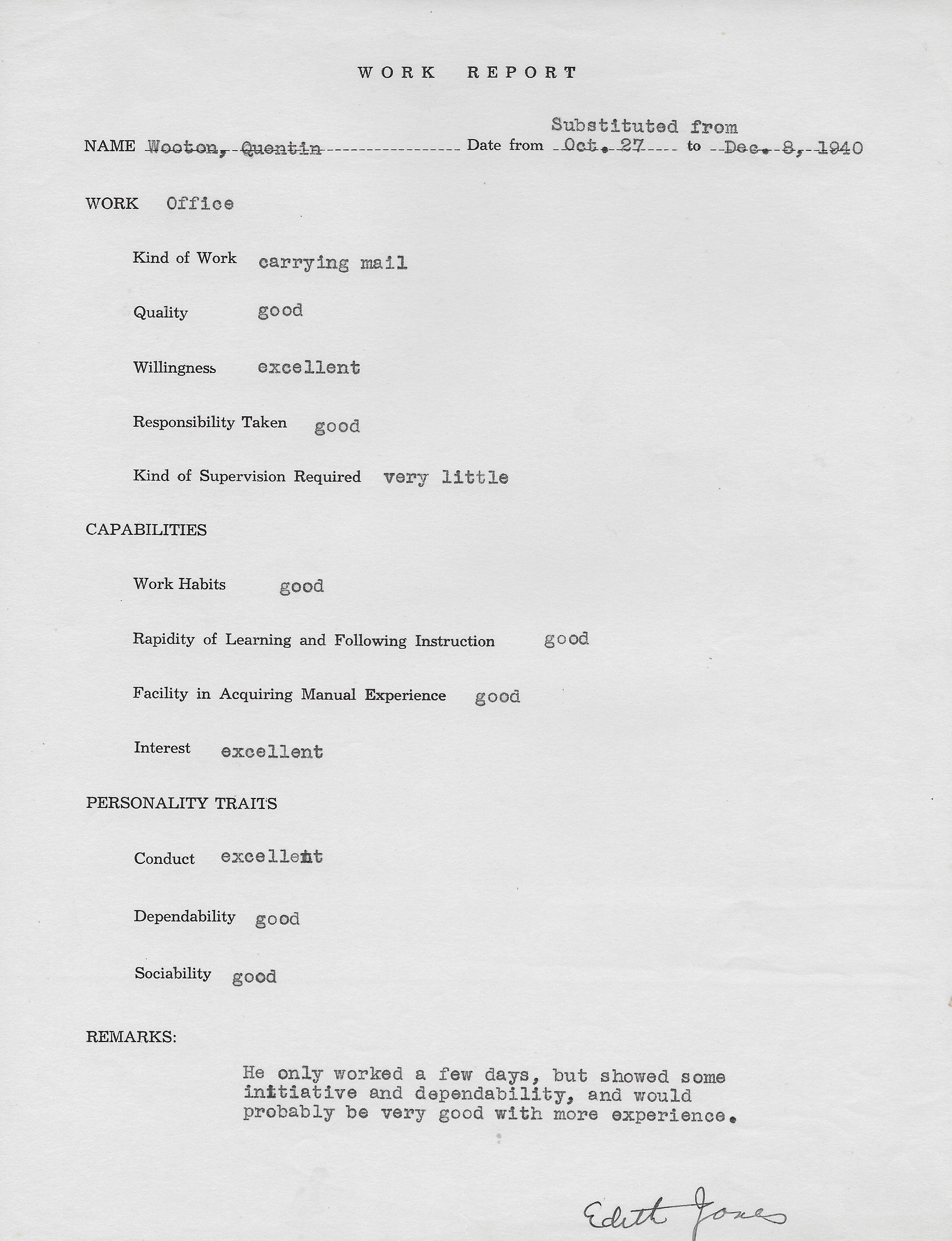SCAN0296. Work Report for Quinten Wooton for Oct. 27 to Dec. [Nov.?] 8, 1940 as a substitute. Supervisor: Edith Jones for Office (carrying mail). Work Habits: “Good.” “He only worked a few days, but showed some initiative and dependability, and would probably be very good with more experience.”