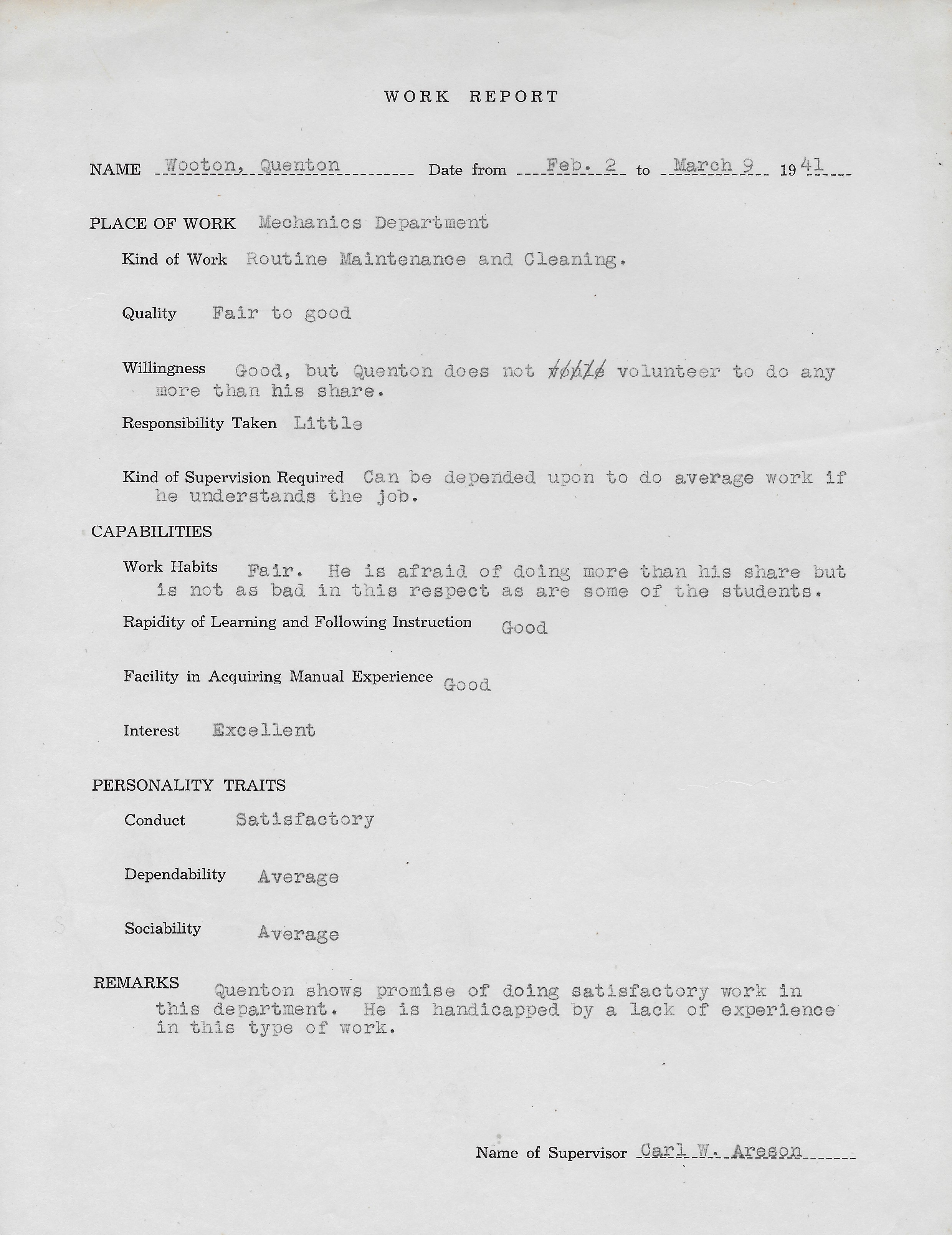 SCAN0298. Work Report for Quinten Wooton for Feb. 2 to March 9, 1941 – Supervisor: Carl W. Areson, Mechanics Department (routine maintenance and cleaning). “Quinten shows promise of doing satisfactory work in this department. He is handicapped by a lack of experience in this type of work.”
