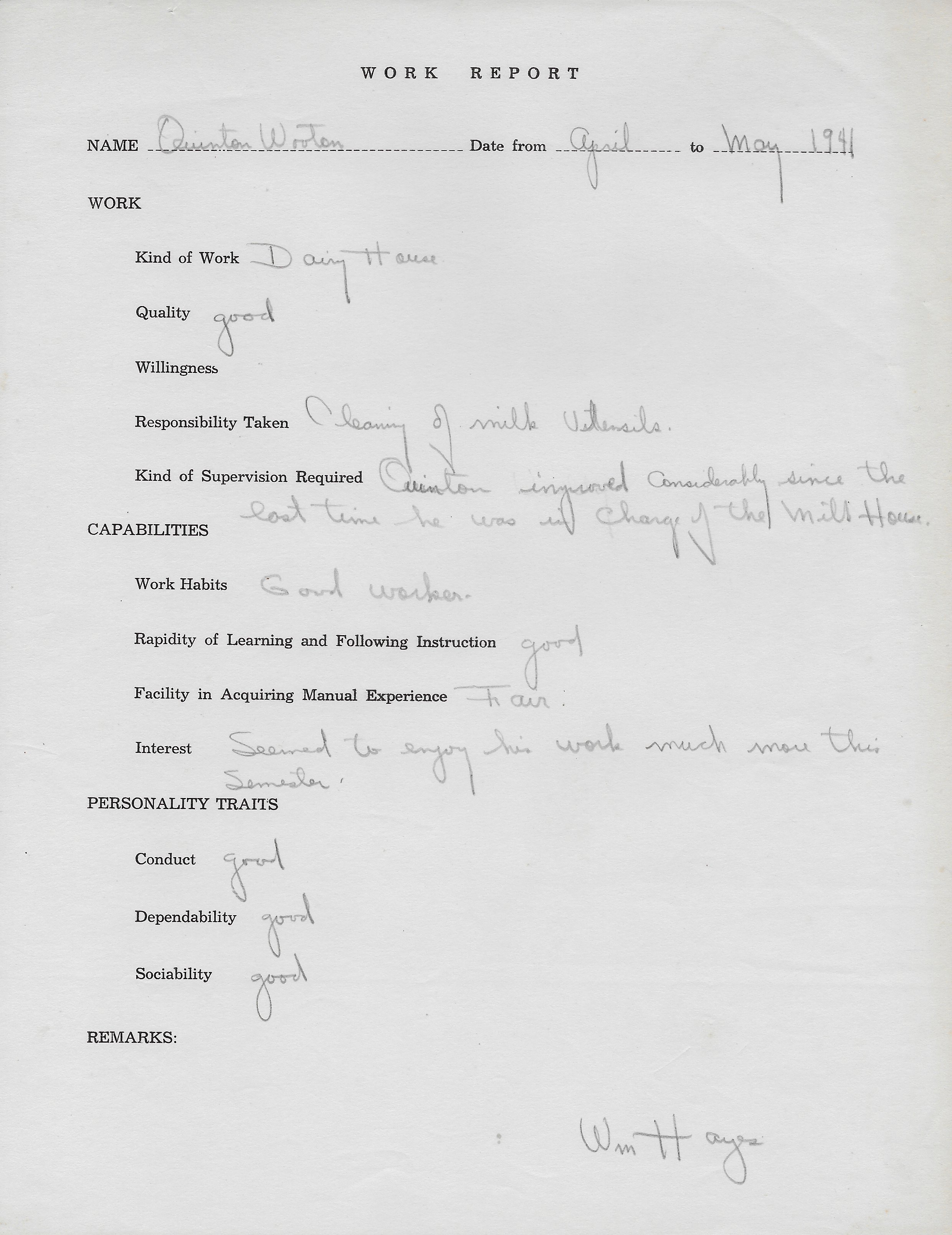 SCAN0299. Work Report for Quinten Wooton for April to May 1941 – Supervisor: William Hayes, Dairy House (cleaning of milk utensils). “Quinten improved considerably….” Work Habits: “Good worker…Seemed to enjoy his work much more this semester.”