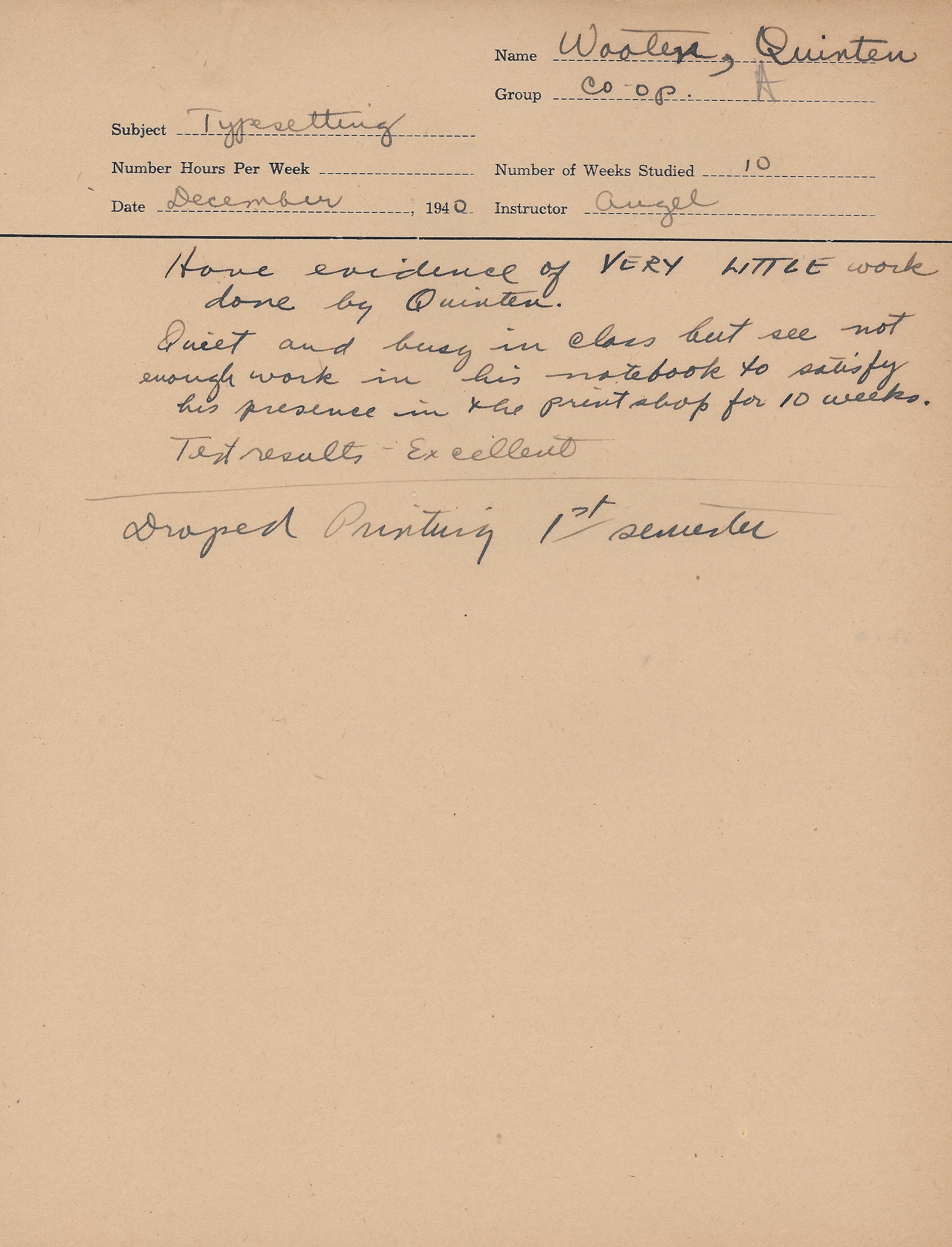 SCAN0300. December 1940 – Instructor’s report for Quinten Wooton Instructor: August Angel, Typesetting. “Quiet and busy in class but see not enough work in his notebook to satisfy his presence in the printshop for 10 weeks. Test results – Excellent.”