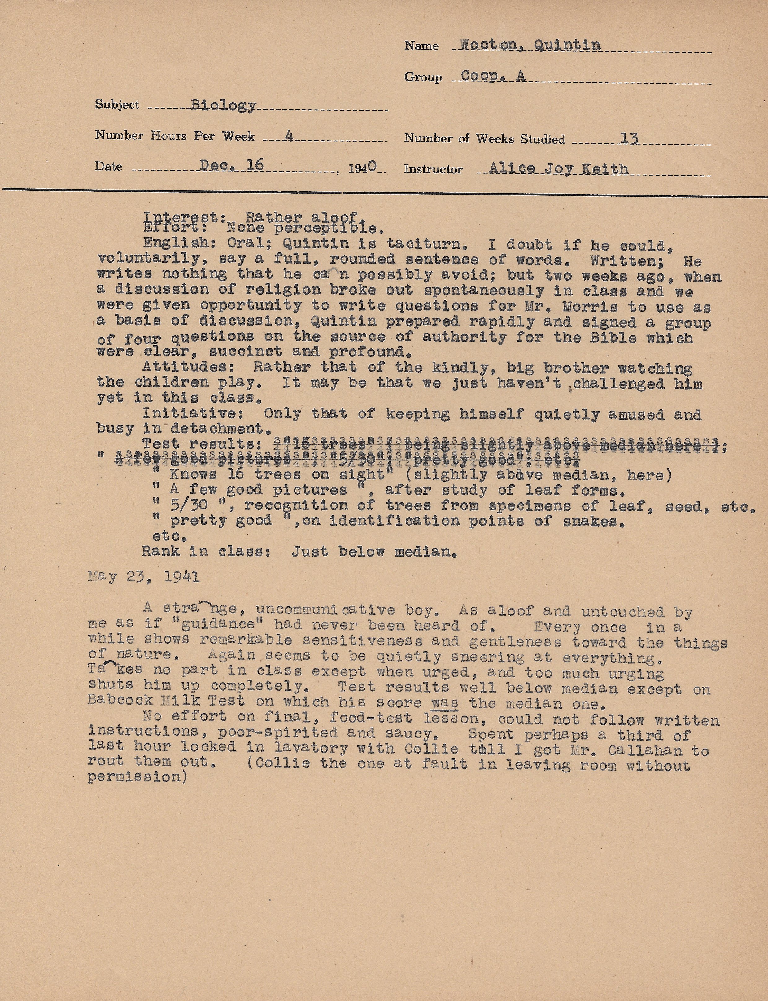 SCAN0302. December 16, 1940 and May 23, 1941 – Instructor’s report for Quinten Wooton for Biology. Instructor: Alice Joy Keith.