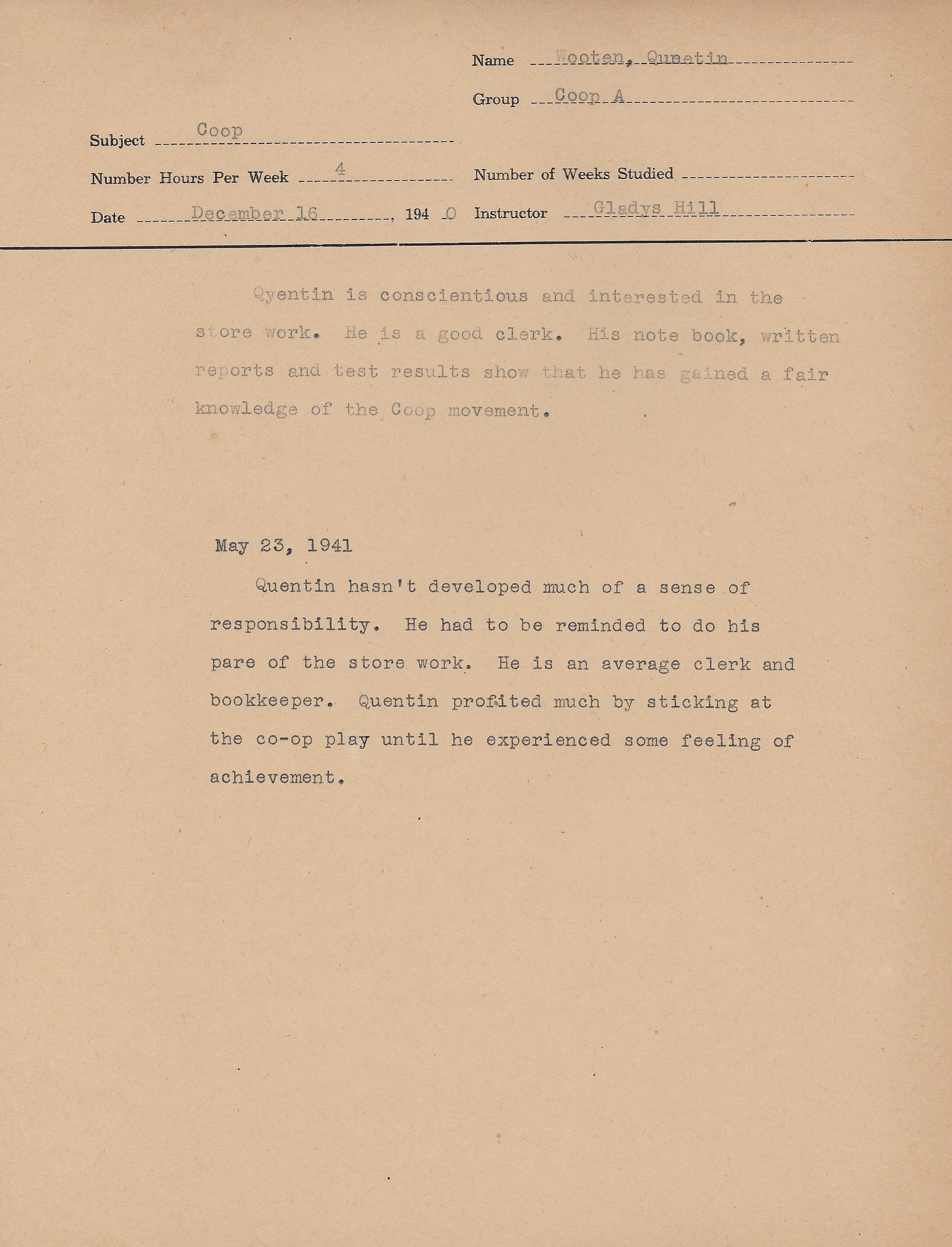 …With help he produced a scene for the co-op play and acted his parts fairly well…. Quinten is blocked from greater achievement by his attitude. His ability was not all used to full capacity.