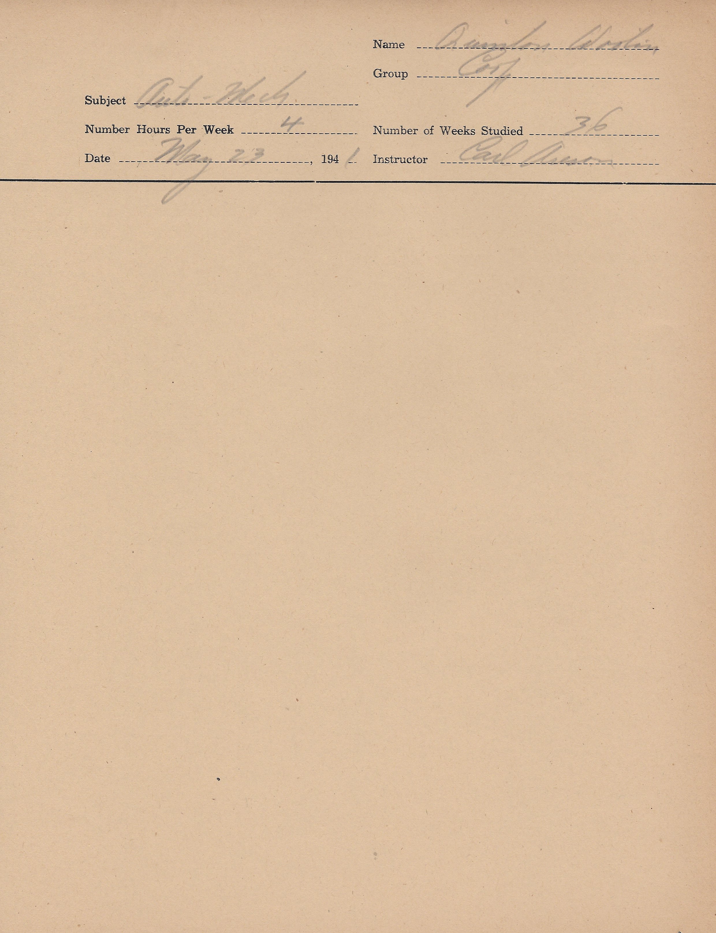 SCAN0306. May 23, 1941 – Instructor’s report for Quinten Wooton for Auto-Mech. Instructor: Carl Areson. [No entries.]